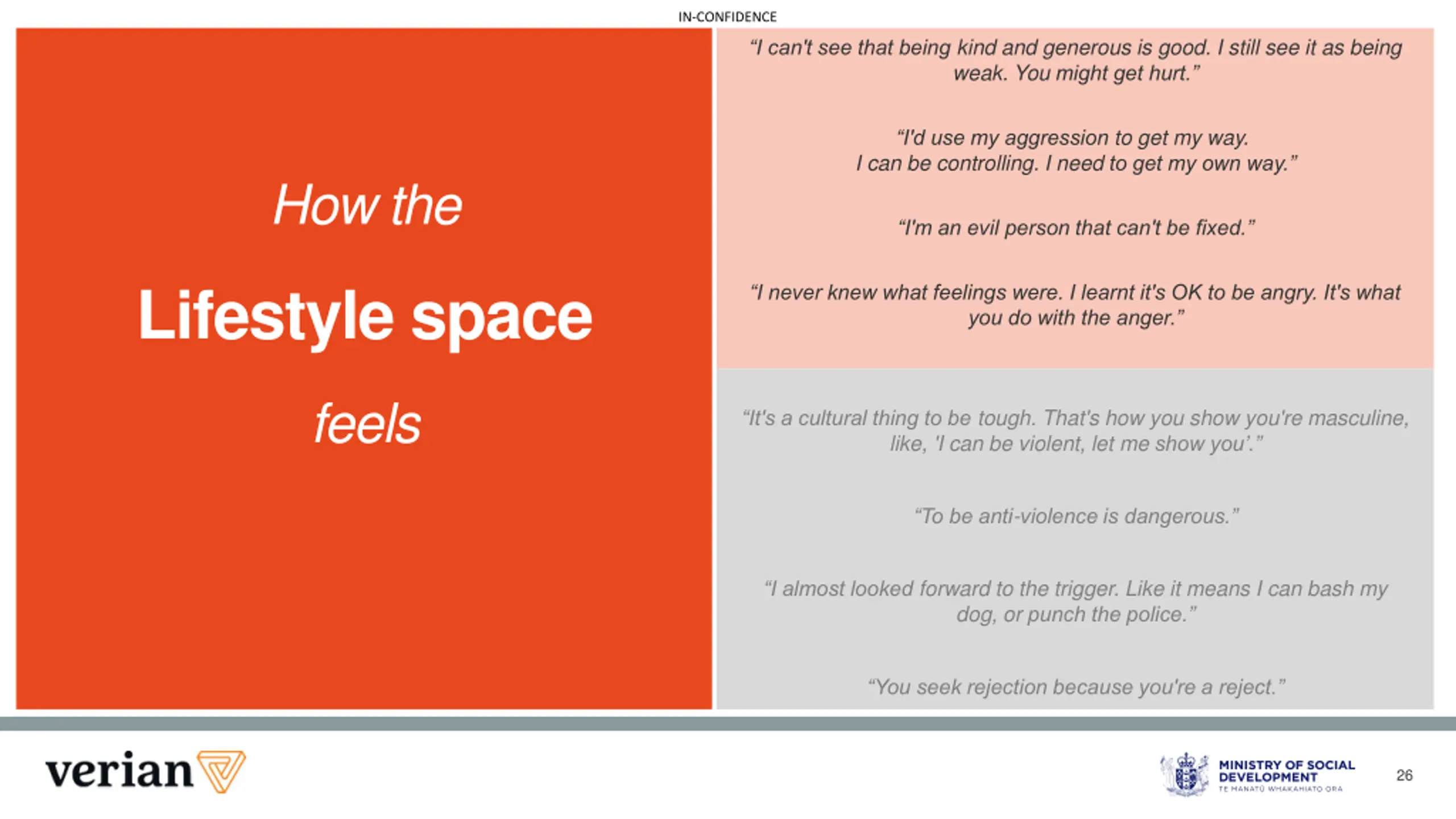 - IN-CONFIDENCE I can't see that being kind and generous is good. I still see it as being weak. You might get hurt. I'd use my aggression to get my way. I can be controlling. I need to get my own way. How the I'm an evil person that can't be fixed. Lifestyle space I never knew what feelings were. I learnt it's OK to be angry. It's what you do with the anger. feels It's a cultural thing to be tough. That's how you show you're masculine, like, 'I can be violent, let me show you . To be anti-violence is dangerous. I almost looked forward to the trigger. Like it means I can bash my dog, or punch the police. You seek rejection because you're a reject. 26