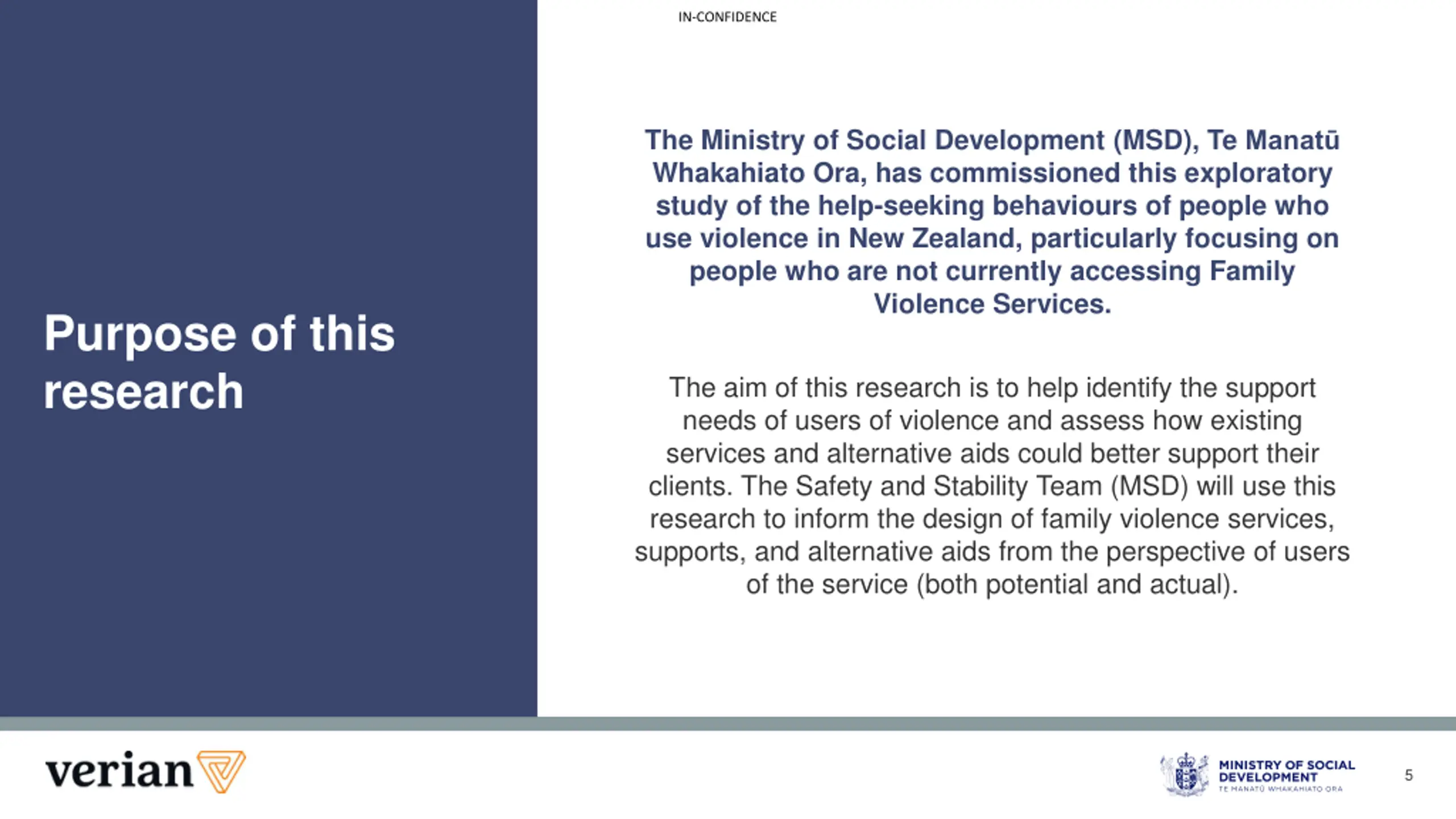 - IN-CONFIDENCE The Ministry of Social Development (MSD), Te Manat Whakahiato Ora, has commissioned this exploratory study of the help-seeking behaviours of people who use violence in New Zealand, particularly focusing on people who are not currently accessing Family Violence Services. Purpose of this research The aim of this research is to help identify the support needs of users of violence and assess how existing services and alternative aids could better support their clients. The Safety and Stability Team (MSD) will use this research to inform the design of family violence services, supports, and alternative aids from the perspective of users of the service (both potential and actual). 5