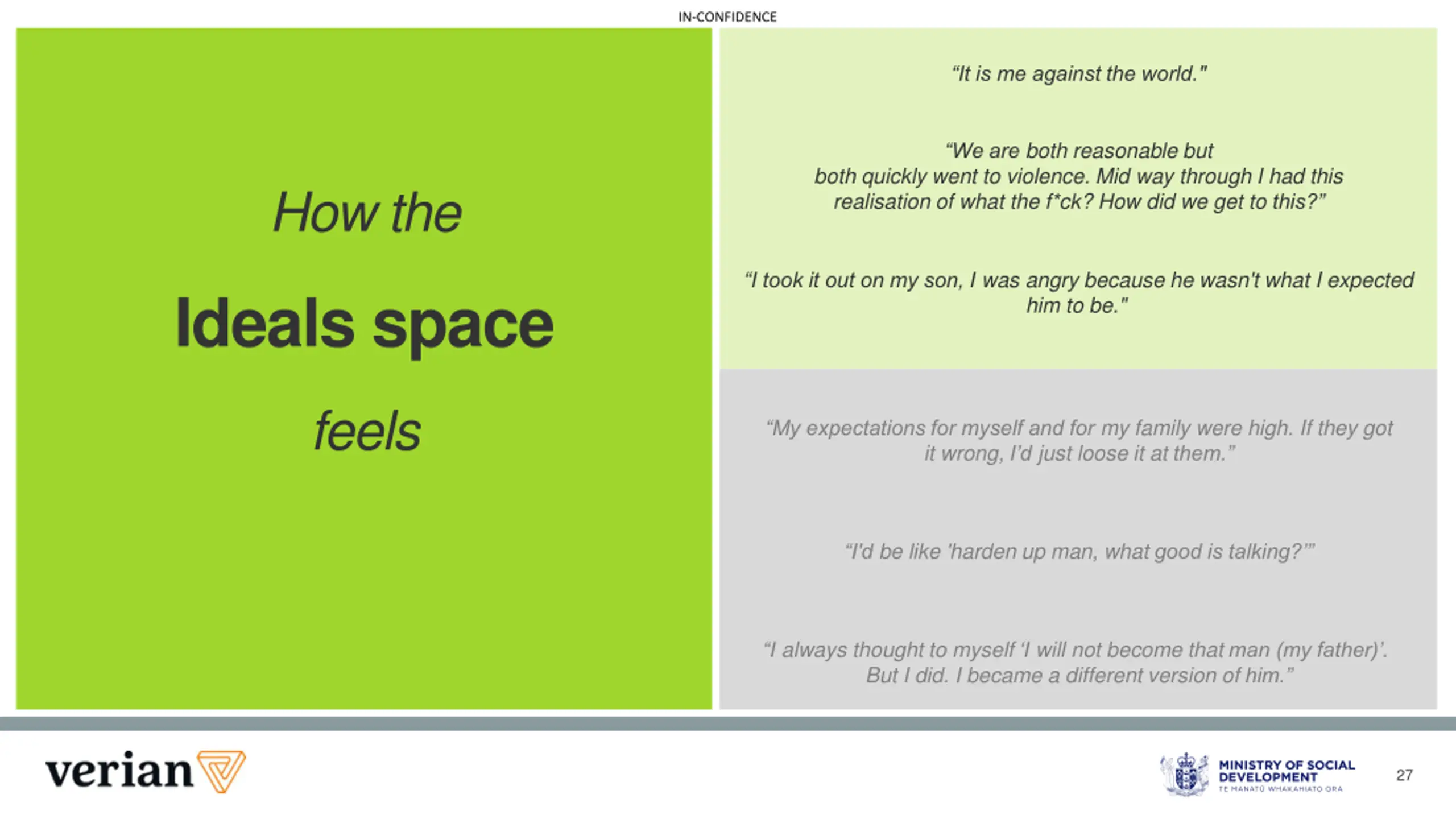 - IN-CONFIDENCE It is me against the world." We are both reasonable but both quickly went to violence. Mid way through I had this realisation of what the f*ck? How did we get to this? How the I took it out on my son, I was angry because he wasn't what I expected him to be." Ideals space feels My expectations for myself and for my family were high. If they got it wrong, I d just loose it at them. I'd be like 'harden up man, what good is talking? I always thought to myself I will not become that man (my father) . But I did. I became a different version of him. 27