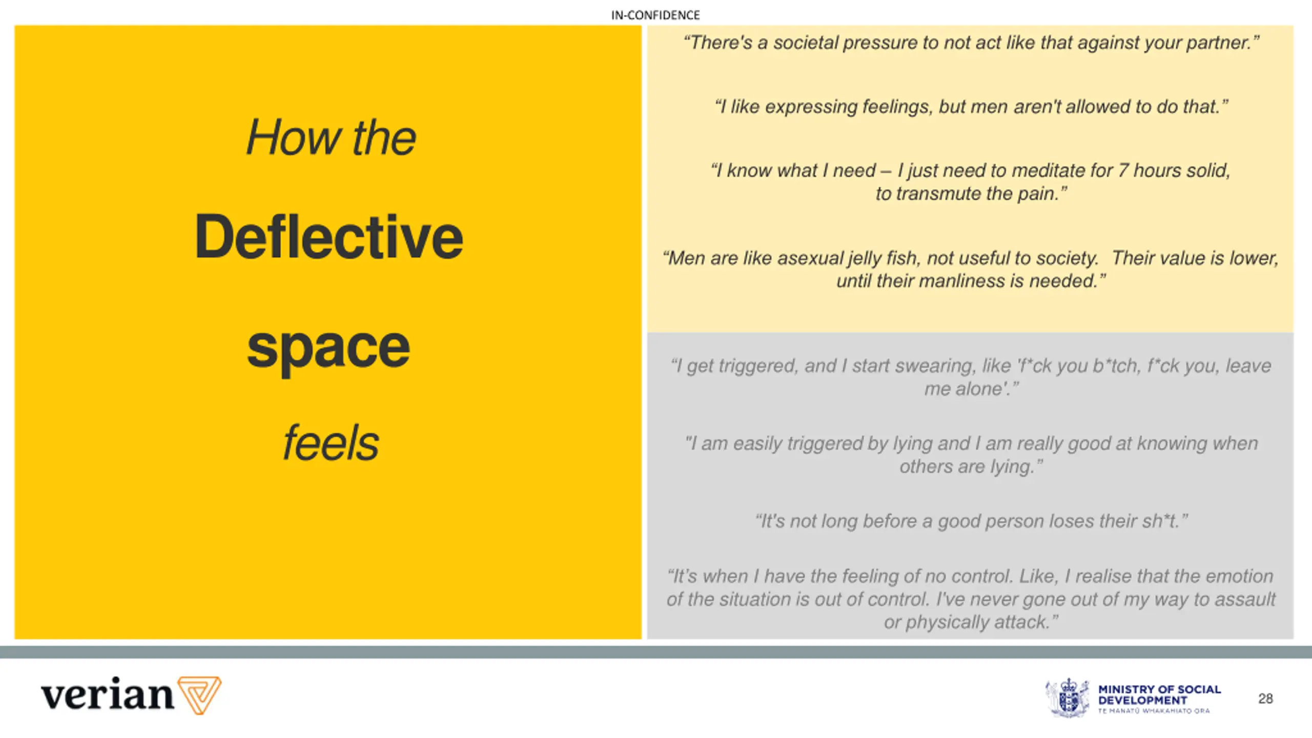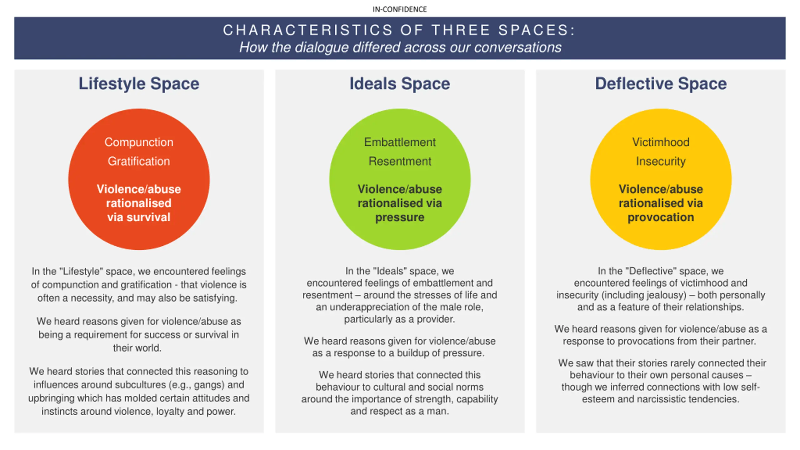 - IN-CONFIDENCE CHARACTERISTICS OF THREE SPACES: How the dialogue differed across our conversations Lifestyle Space Ideals Space Deflective Space Compunction Gratification Embattlement Resentment Victimhood Insecurity Violence/abuse rationalised via survival Violence/abuse rationalised via pressure Violence/abuse rationalised via provocation In the "Ideals" space, we encountered feelings of embattlement and resentment around the stresses of life and an underappreciation of the male role, particularly as a provider. In the "Deflective" space, we encountered feelings of victimhood and insecurity (including jealousy) both personally and as a feature of their relationships. In the "Lifestyle" space, we encountered feelings of compunction and gratification - that violence is often a necessity, and may also be satisfying. We heard reasons given for violence/abuse as being a requirement for success or survival in their world. We heard reasons given for violence/abuse as a response to provocations from their partner. We heard reasons given for violence/abuse as a response to a buildup of pressure. We saw that their stories rarely connected their behaviour to their own personal causes though we inferred connections with low self- esteem and narcissistic tendencies. We heard stories that connected this reasoning to influences around subcultures (e.g., gangs) and upbringing which has molded certain attitudes and instincts around violence, loyalty and power. We heard stories that connected this behaviour to cultural and social norms around the importance of strength, capability and respect as a man. 29