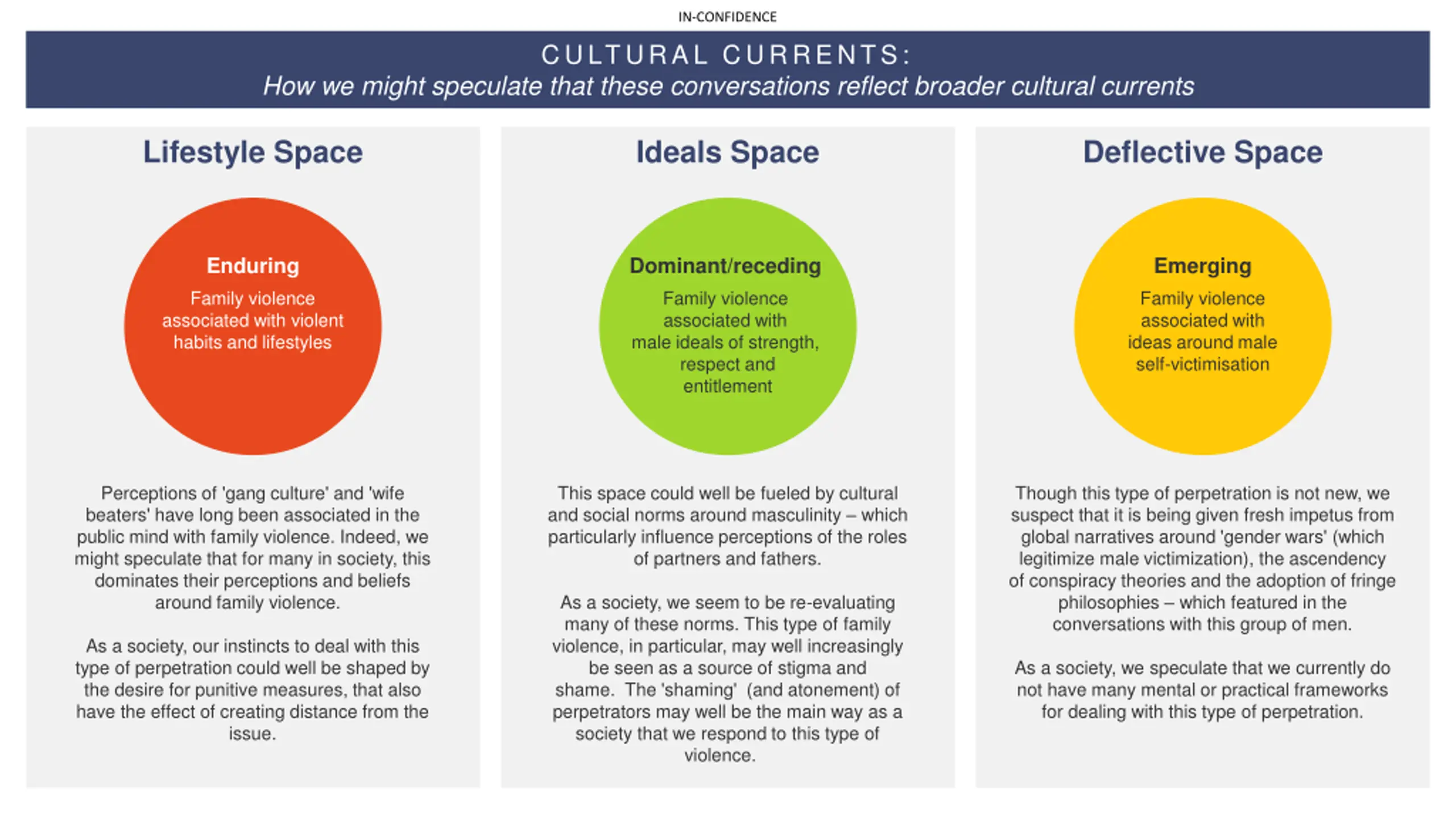 - IN-CONFIDENCE CULTURAL CURRENTS: How we might speculate that these conversations reflect broader cultural currents Lifestyle Space Ideals Space Deflective Space Enduring Dominant/receding Emerging Family violence associated with violent habits and lifestyles Family violence associated with male ideals of strength, respect and entitlement Family violence associated with ideas around male self-victimisation Perceptions of 'gang culture' and 'wife beaters' have long been associated in the public mind with family violence. Indeed, we might speculate that for many in society, this dominates their perceptions and beliefs around family violence. This space could well be fueled by cultural and social norms around masculinity which particularly influence perceptions of the roles of partners and fathers. Though this type of perpetration is not new, we suspect that it is being given fresh impetus from global narratives around 'gender wars' (which legitimize male victimization), the ascendency of conspiracy theories and the adoption of fringe philosophies which featured in the conversations with this group of men. As a society, we seem to be re-evaluating many of these norms. This type of family violence, in particular, may well increasingly be seen as a source of stigma and shame. The 'shaming' (and atonement) of perpetrators may well be the main way as a society that we respond to this type of violence. As a society, our instincts to deal with this type of perpetration could well be shaped by the desire for punitive measures, that also have the effect of creating distance from the issue. As a society, we speculate that we currently do not have many mental or practical frameworks for dealing with this type of perpetration. 30