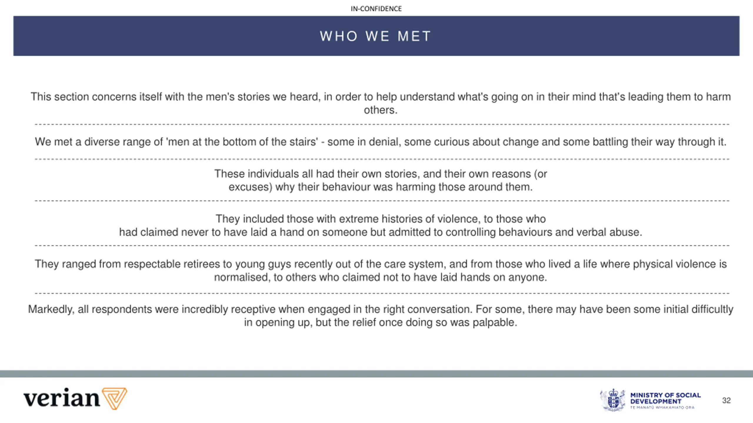 - IN-CONFIDENCE WHO WE MET This section concerns itself with the men's stories we heard, in order to help understand what's going on in their mind that's leading them to harm others. We met a diverse range of 'men at the bottom of the stairs' - some in denial, some curious about change and some battling their way through it. These individuals all had their own stories, and their own reasons (or excuses) why their behaviour was harming those around them. They included those with extreme histories of violence, to those who had claimed never to have laid a hand on someone but admitted to controlling behaviours and verbal abuse. They ranged from respectable retirees to young guys recently out of the care system, and from those who lived a life where physical violence is normalised, to others who claimed not to have laid hands on anyone. Markedly, all respondents were incredibly receptive when engaged in the right conversation. For some, there may have been some initial difficultly in opening up, but the relief once doing so was palpable. 32