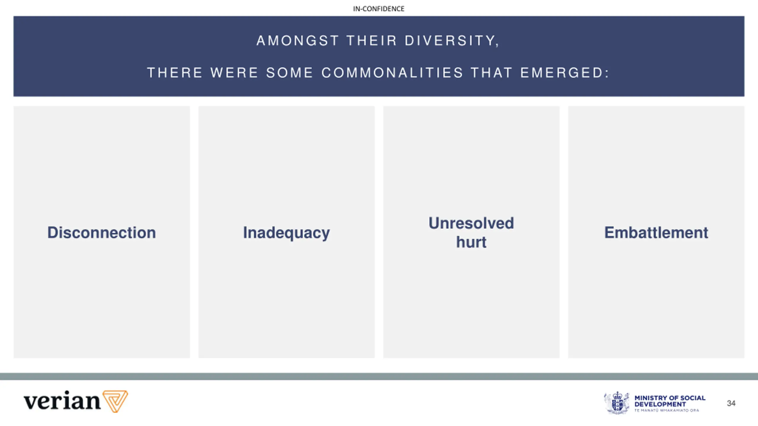 - IN-CONFIDENCE AMONGST THEIR DIVERSITY, THERE WERE SOME COMMONALITIES THAT EMERGED: Unresolved hurt Disconnection Inadequacy Embattlement 34