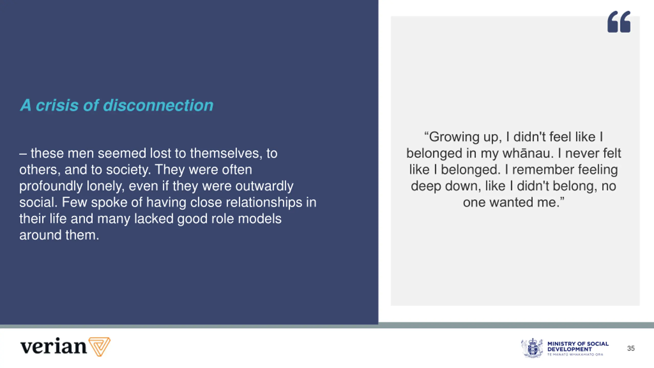 - IN-CONFIDENCE A crisis of disconnection Growing up, I didn't feel like I belonged in my wh nau. I never felt like I belonged. I remember feeling deep down, like I didn't belong, no one wanted me. these men seemed lost to themselves, to others, and to society. They were often profoundly lonely, even if they were outwardly social. Few spoke of having close relationships in their life and many lacked good role models around them. 35