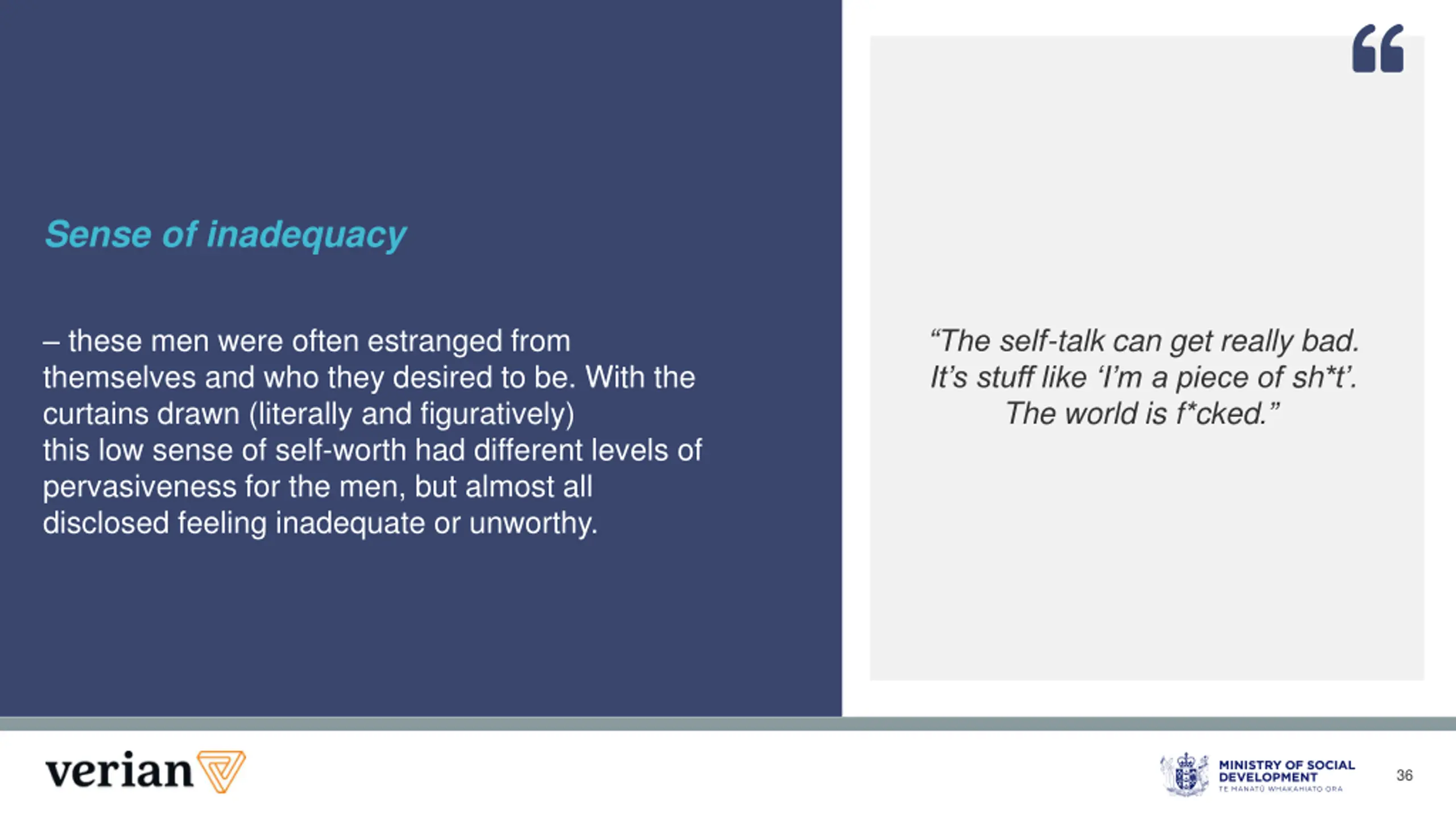 - IN-CONFIDENCE Sense of inadequacy these men were often estranged from themselves and who they desired to be. With the curtains drawn (literally and figuratively) this low sense of self-worth had different levels of pervasiveness for the men, but almost all disclosed feeling inadequate or unworthy. The self-talk can get really bad. It s stuff like I m a piece of sh*t . The world is f*cked. 36