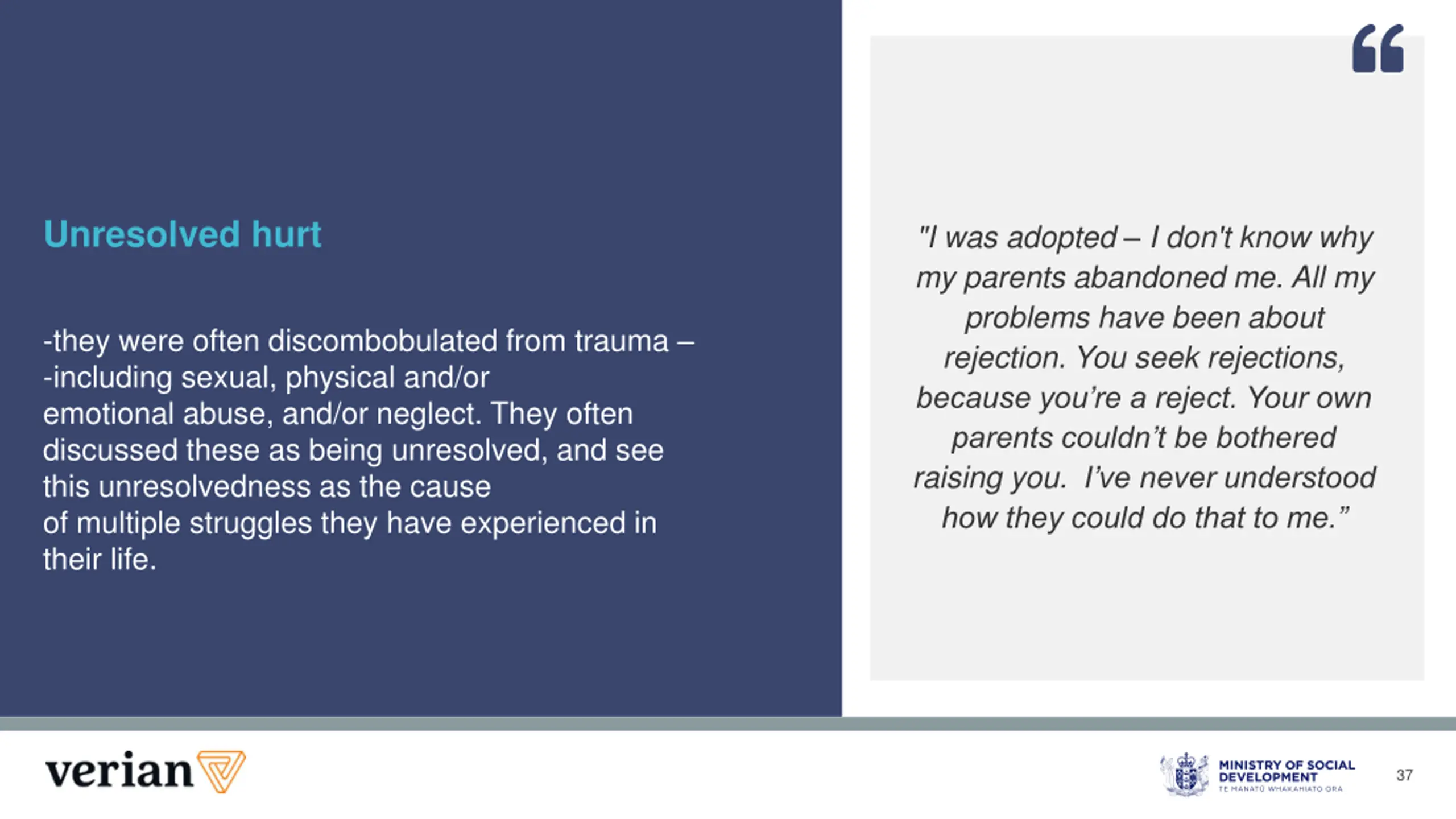 - IN-CONFIDENCE Unresolved hurt "I was adopted I don't know why my parents abandoned me. All my problems have been about rejection. You seek rejections, because you re a reject. Your own parents couldn t be bothered raising you. I ve never understood how they could do that to me. -they were often discombobulated from trauma -including sexual, physical and/or emotional abuse, and/or neglect. They often discussed these as being unresolved, and see this unresolvedness as the cause of multiple struggles they have experienced in their life. 37