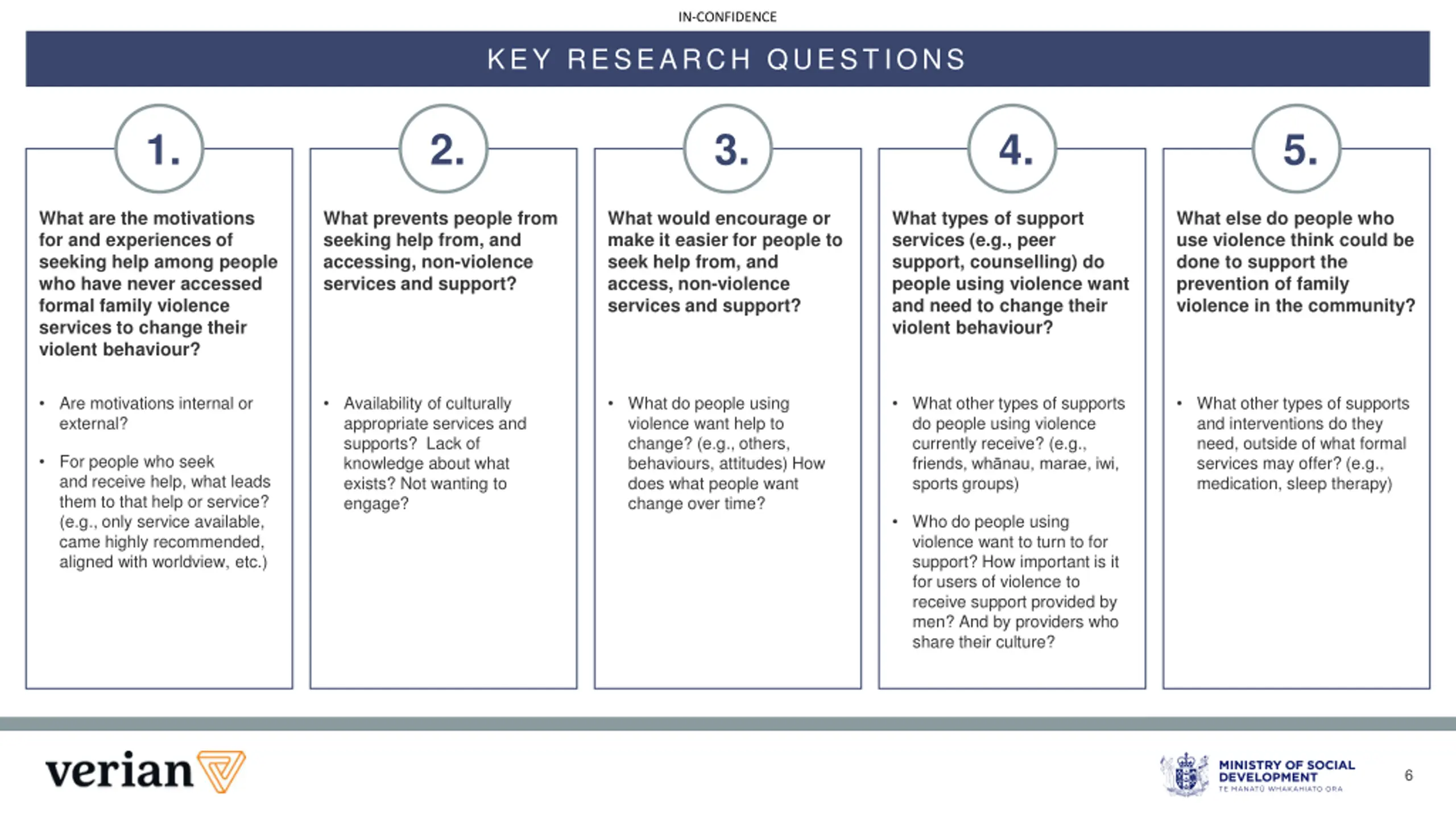 - IN-CONFIDENCE KEY RESEARCH QUESTIONS 1. 2. 3. 4. 5. What are the motivations for and experiences of seeking help among people who have never accessed formal family violence services to change their violent behaviour? What prevents people from seeking help from, and accessing, non-violence services and support? What would encourage or make it easier for people to seek help from, and access, non-violence services and support? What types of support services (e.g., peer support, counselling) do people using violence want and need to change their violent behaviour? What else do people who use violence think could be done to support the prevention of family violence in the community? Are motivations internal or external? Availability of culturally appropriate services and supports? Lack of knowledge about what exists? Not wanting to engage? What do people using violence want help to change? (e.g., others, behaviours, attitudes) How does what people want change over time? What other types of supports do people using violence currently receive? (e.g., friends, wh nau, marae, iwi, sports groups) What other types of supports and interventions do they need, outside of what formal services may offer? (e.g., medication, sleep therapy) For people who seek and receive help, what leads them to that help or service? (e.g., only service available, came highly recommended, aligned with worldview, etc.) Who do people using violence want to turn to for support? How important is it for users of violence to receive support provided by men? And by providers who share their culture? 6