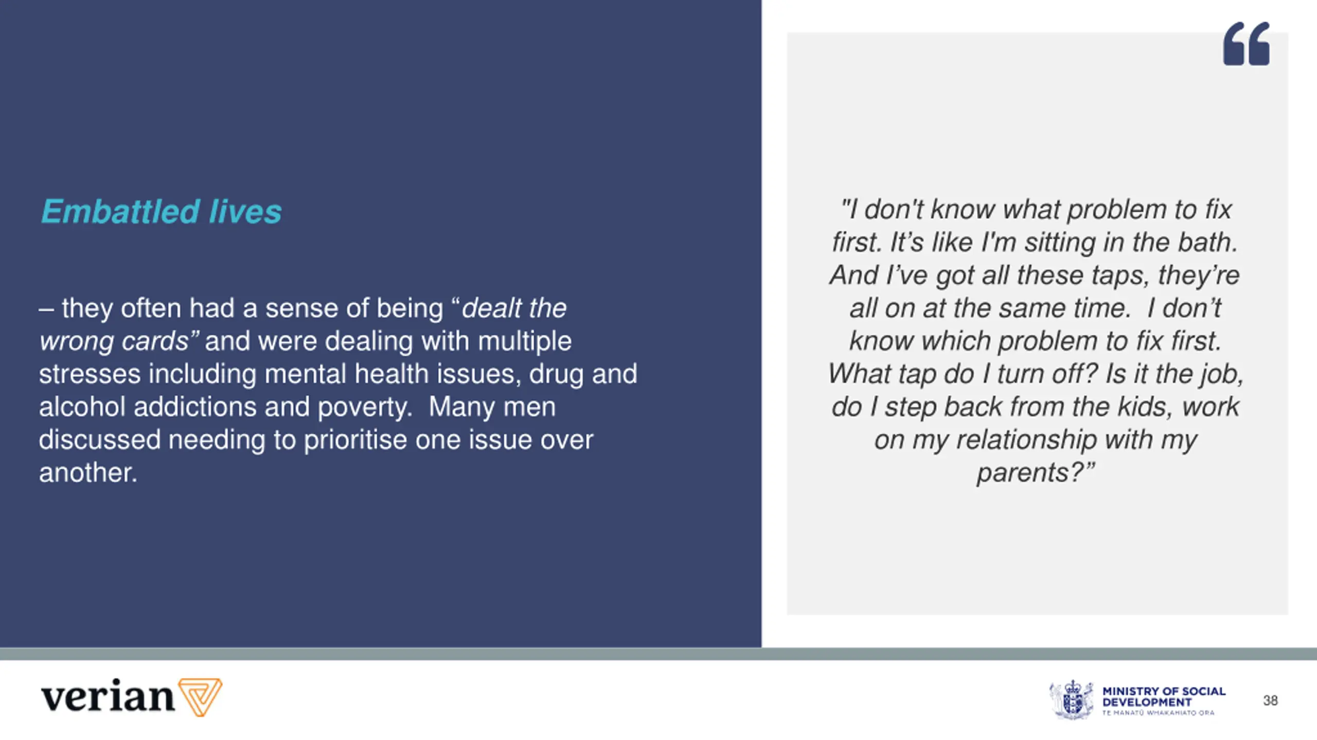 - IN-CONFIDENCE Embattled lives "I don't know what problem to fix first. It s like I'm sitting in the bath. And I ve got all these taps, they re all on at the same time. I don t know which problem to fix first. What tap do I turn off? Is it the job, do I step back from the kids, work on my relationship with my parents? they often had a sense of being dealt the wrong cards and were dealing with multiple stresses including mental health issues, drug and alcohol addictions and poverty. Many men discussed needing to prioritise one issue over another. 38
