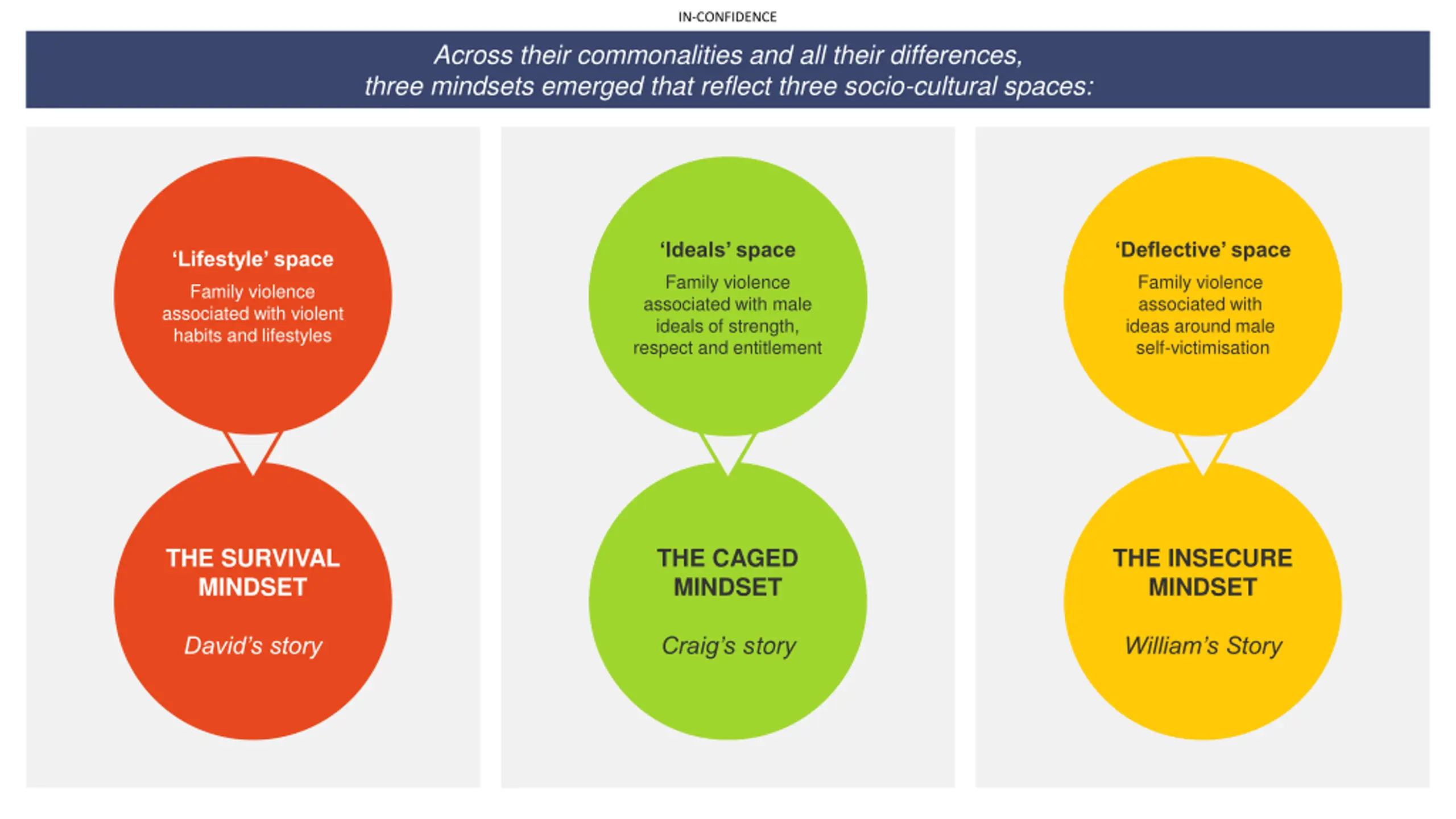 - IN-CONFIDENCE Across their commonalities and all their differences, three mindsets emerged that reflect three socio-cultural spaces: Deflective space Deflective space Ideals space Ideals space Lifestyle space Family violence associated with male ideals of strength, respect and entitlement Family violence associated with ideas around male self- victimisation Family violence associated with male ideals of strength, respect and entitlement Family violence associated with ideas around male self-victimisation Family violence associated with violent habits and lifestyles THE SURVIVAL MINDSET THE CAGED MINDSET THE INSECURE MINDSET Craig s story David s story William s Story 39