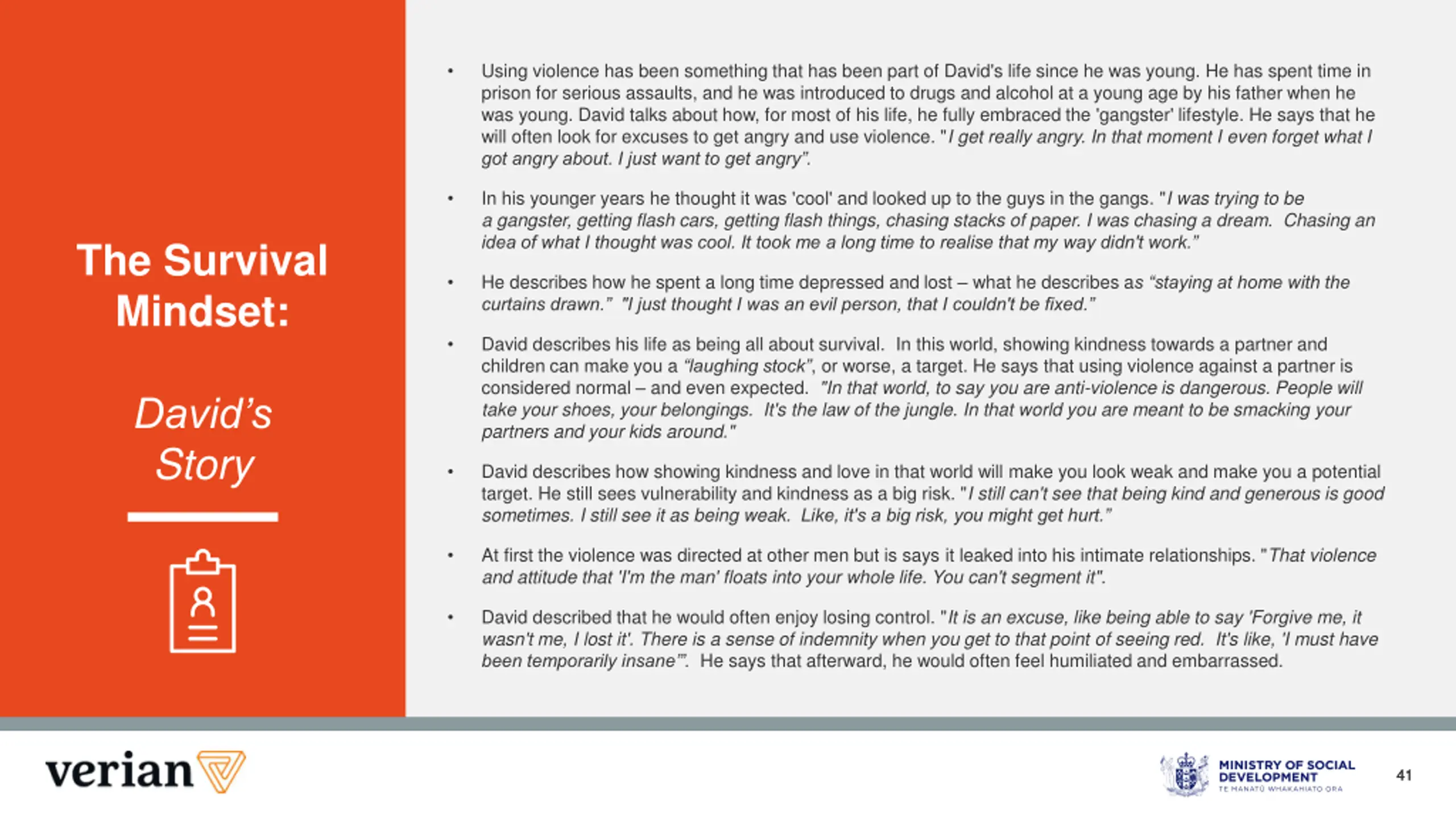- IN-CONFIDENCE Using violence has been something that has been part of David's life since he was young. He has spent time in prison for serious assaults, and he was introduced to drugs and alcohol at a young age by his father when he was young. David talks about how, for most of his life, he fully embraced the 'gangster' lifestyle. He says that he will often look for excuses to get angry and use violence. "I get really angry. In that moment I even forget what I got angry about. I just want to get angry . In his younger years he thought it was 'cool' and looked up to the guys in the gangs. "I was trying to be a gangster, getting flash cars, getting flash things, chasing stacks of paper. I was chasing a dream. Chasing an idea of what I thought was cool. It took me a long time to realise that my way didn't work. The Survival Mindset: He describes how he spent a long time depressed and lost what he describes as staying at home with the curtains drawn. "I just thought I was an evil person, that I couldn't be fixed. David describes his life as being all about survival. In this world, showing kindness towards a partner and children can make you a laughing stock , or worse, a target. He says that using violence against a partner is considered normal and even expected. "In that world, to say you are anti-violence is dangerous. People will take your shoes, your belongings. It's the law of the jungle. In that world you are meant to be smacking your partners and your kids around." David s Story David describes how showing kindness and love in that world will make you look weak and make you a potential target. He still sees vulnerability and kindness as a big risk. "I still can't see that being kind and generous is good sometimes. I still see it as being weak. Like, it's a big risk, you might get hurt. At first the violence was directed at other men but is says it leaked into his intimate relationships. "That violence and attitude that 'I'm the man' floats into your whole life. You can't segment it". David described that he would often enjoy losing control. "It is an excuse, like being able to say 'Forgive me, it wasn't me, I lost it'. There is a sense of indemnity when you get to that point of seeing red. It's like, 'I must have been temporarily insane .He says that afterward, he would often feel humiliated and embarrassed. 41 41
