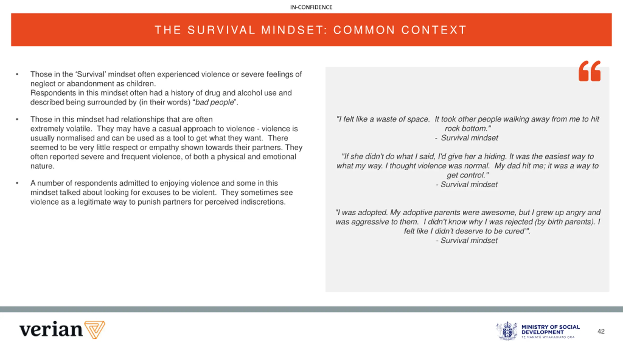 - IN-CONFIDENCE THE SURVIVAL MINDSET: COMMON CONTEXT Those in the Survival mindset often experienced violence or severe feelings of neglect or abandonment as children. Respondents in this mindset often had a history of drug and alcohol use and described being surrounded by (in their words) bad people . "I felt like a waste of space. It took other people walking away from me to hit rock bottom." - Survival mindset Those in this mindset had relationships that are often extremely volatile. They may have a casual approach to violence - violence is usually normalised and can be used as a tool to get what they want. There seemed to be very little respect or empathy shown towards their partners. They often reported severe and frequent violence, of both a physical and emotional nature. "If she didn't do what I said, I'd give her a hiding. It was the easiest way to what my way. I thought violence was normal. My dad hit me; it was a way to get control." - Survival mindset A number of respondents admitted to enjoying violence and some in this mindset talked about looking for excuses to be violent. They sometimes see violence as a legitimate way to punish partners for perceived indiscretions. "I was adopted. My adoptive parents were awesome, but I grew up angry and was aggressive to them. I didn't know why I was rejected (by birth parents). I felt like I didn t deserve to be cured ". - Survival mindset 42