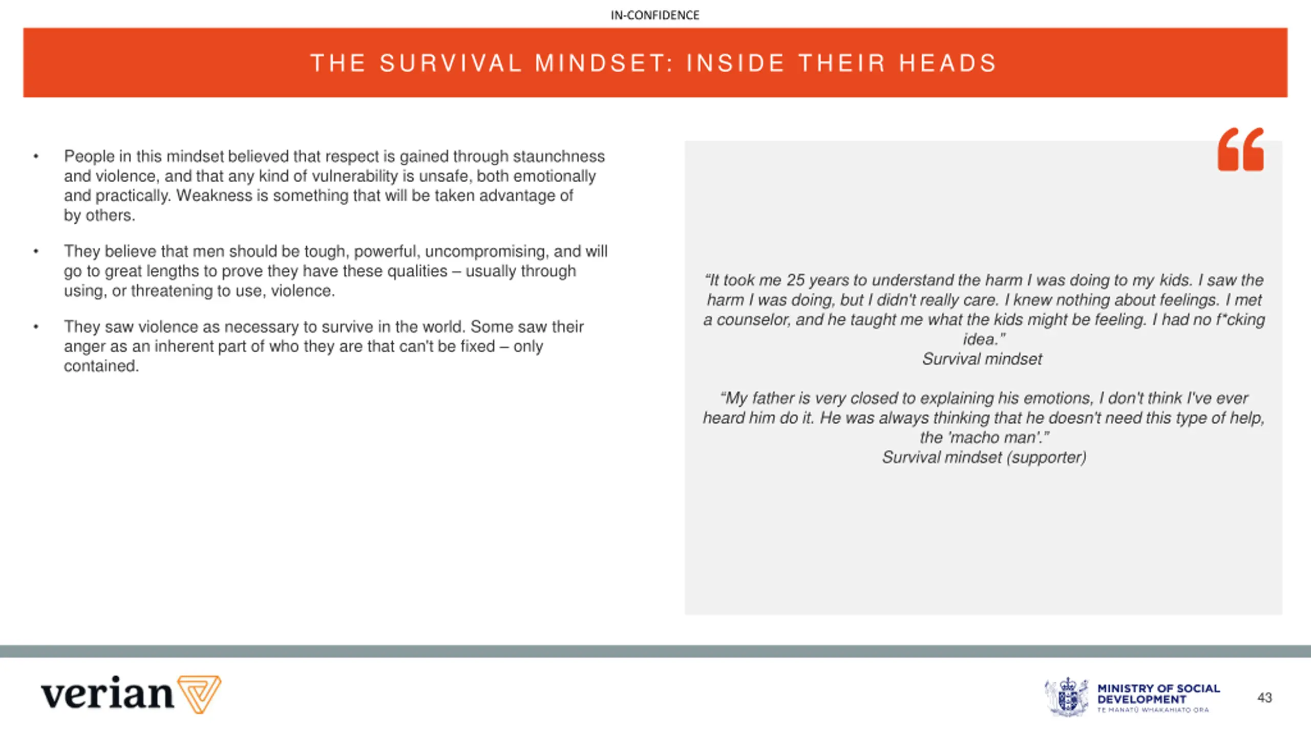 - IN-CONFIDENCE THE SURVIVAL MINDSET: INSIDE THEIR HEADS People in this mindset believed that respect is gained through staunchness and violence, and that any kind of vulnerability is unsafe, both emotionally and practically. Weakness is something that will be taken advantage of by others. They believe that men should be tough, powerful, uncompromising, and will go to great lengths to prove they have these qualities usually through using, or threatening to use, violence. It took me 25 years to understand the harm I was doing to my kids. I saw the harm I was doing, but I didn't really care. I knew nothing about feelings. I met a counselor, and he taught me what the kids might be feeling. I had no f*cking idea. Survival mindset They saw violence as necessary to survive in the world. Some saw their anger as an inherent part of who they are that can't be fixed only contained. My father is very closed to explaining his emotions, I don't think I've ever heard him do it. He was always thinking that he doesn't need this type of help, the 'macho man'. Survival mindset (supporter) 43