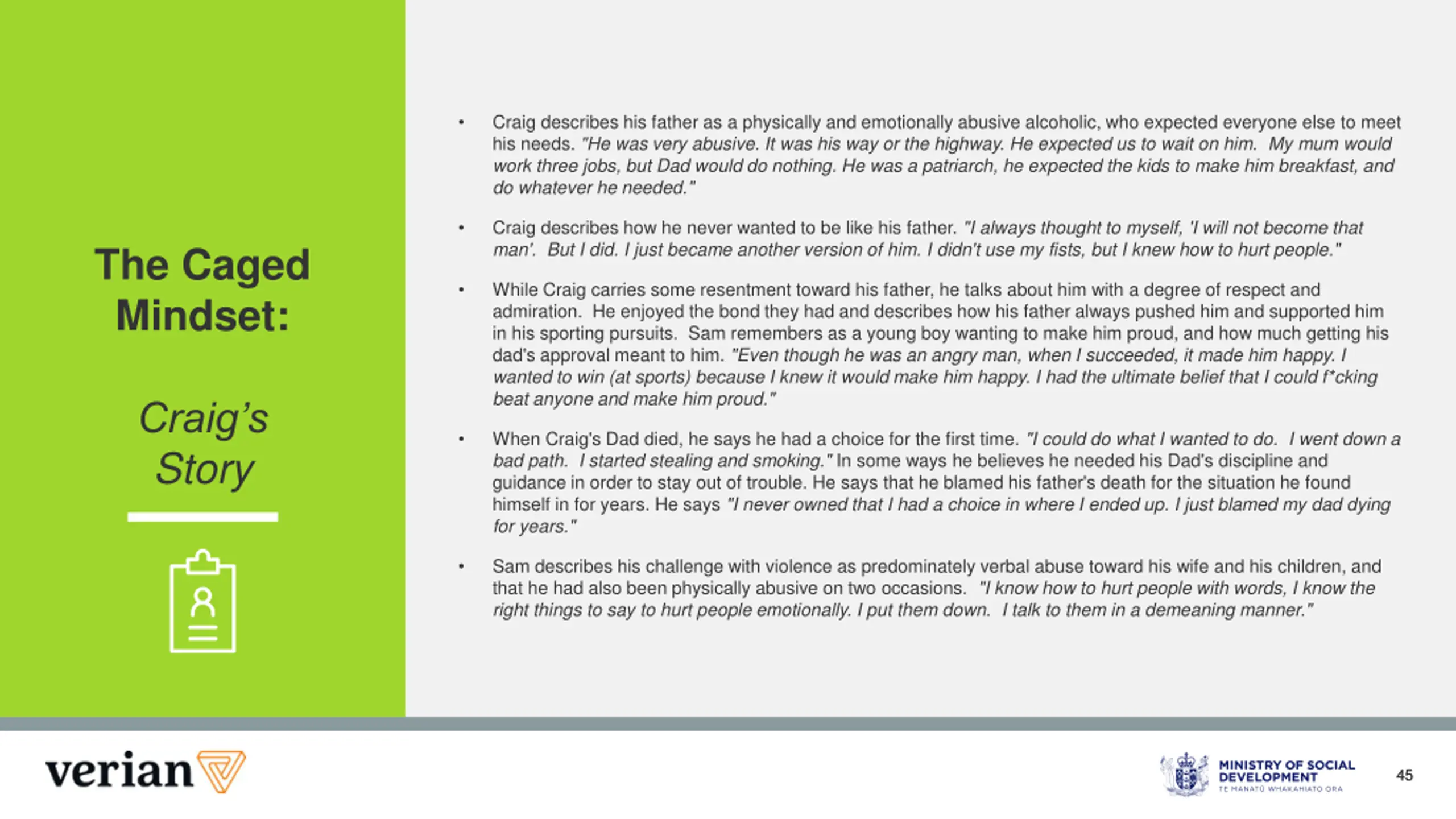 - IN-CONFIDENCE Craig describes his father as a physically and emotionally abusive alcoholic, who expected everyone else to meet his needs. "He was very abusive. It was his way or the highway. He expected us to wait on him. My mum would work three jobs, but Dad would do nothing. He was a patriarch, he expected the kids to make him breakfast, and do whatever he needed." Craig describes how he never wanted to be like his father. "I always thought to myself, 'I will not become that man'. But I did. I just became another version of him. I didn't use my fists, but I knew how to hurt people." The Caged Mindset: While Craig carries some resentment toward his father, he talks about him with a degree of respect and admiration. He enjoyed the bond they had and describes how his father always pushed him and supported him in his sporting pursuits. Sam remembers as a young boy wanting to make him proud, and how much getting his dad's approval meant to him. "Even though he was an angry man, when I succeeded, it made him happy. I wanted to win (at sports) because I knew it would make him happy. I had the ultimate belief that I could f*cking beat anyone and make him proud." Craig s Story When Craig's Dad died, he says he had a choice for the first time. "I could do what I wanted to do. I went down a bad path. I started stealing and smoking." In some ways he believes he needed his Dad's discipline and guidance in order to stay out of trouble. He says that he blamed his father's death for the situation he found himself in for years. He says "I never owned that I had a choice in where I ended up. I just blamed my dad dying for years." Sam describes his challenge with violence as predominately verbal abuse toward his wife and his children, and that he had also been physically abusive on two occasions. "I know how to hurt people with words, I know the right things to say to hurt people emotionally. I put them down. I talk to them in a demeaning manner." 45 45