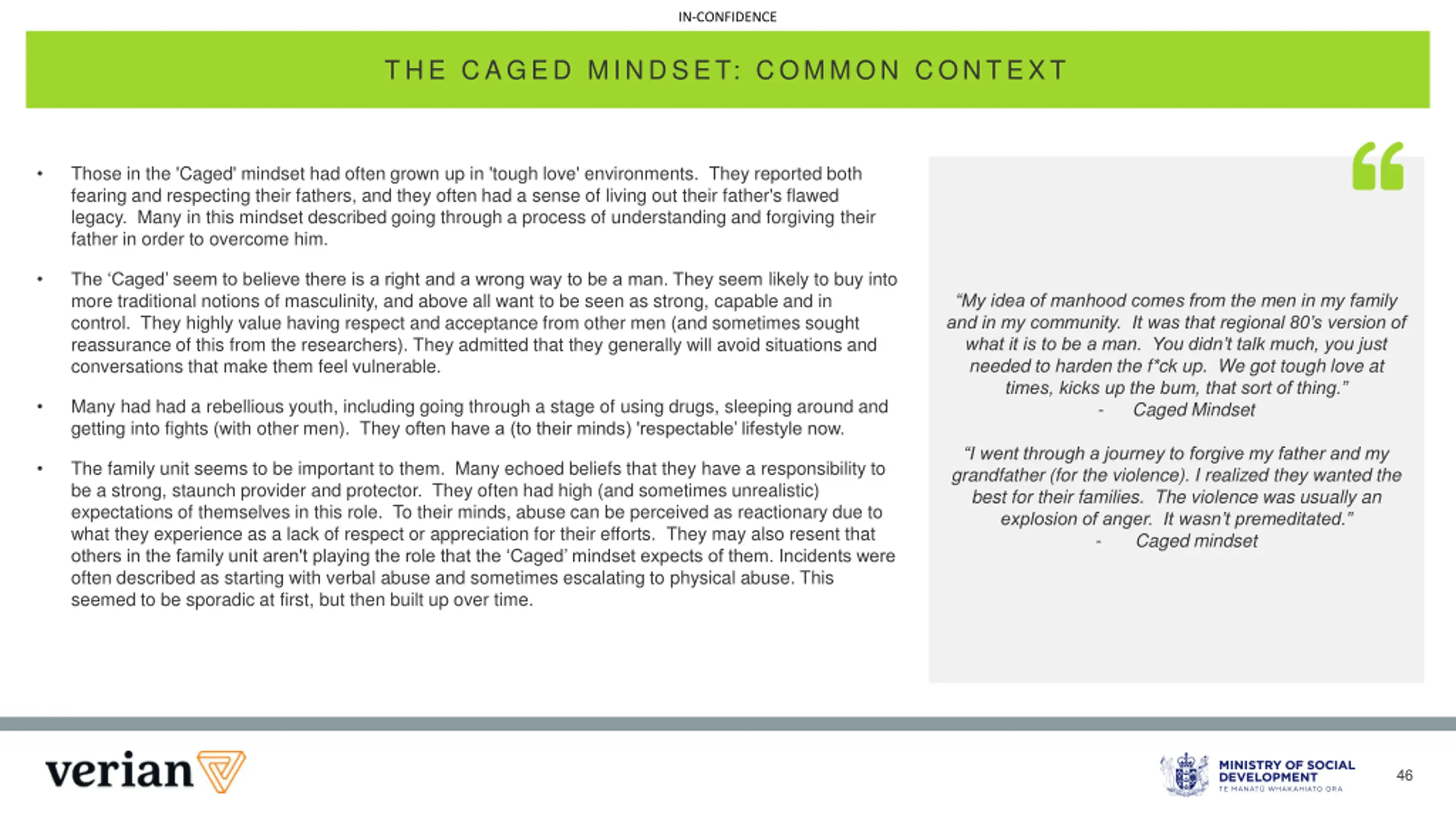 - IN-CONFIDENCE THE CAGED MINDSET: COMMON CONTEXT Those in the 'Caged' mindset had often grown up in 'tough love' environments. They reported both fearing and respecting their fathers, and they often had a sense of living out their father's flawed legacy. Many in this mindset described going through a process of understanding and forgiving their father in order to overcome him. The Caged seem to believe there is a right and a wrong way to be a man. They seem likely to buy into more traditional notions of masculinity, and above all want to be seen as strong, capable and in control. They highly value having respect and acceptance from other men (and sometimes sought reassurance of this from the researchers). They admitted that they generally will avoid situations and conversations that make them feel vulnerable. My idea of manhood comes from the men in my family and in my community. It was that regional 80 s version of what it is to be a man. You didn t talk much, you just needed to harden the f*ck up. We got tough love at times, kicks up the bum, that sort of thing. - Caged Mindset Many had had a rebellious youth, including going through a stage of using drugs, sleeping around and getting into fights (with other men). They often have a (to their minds) 'respectable lifestyle now. I went through a journey to forgive my father and my grandfather (for the violence). I realized they wanted the best for their families. The violence was usually an explosion of anger. It wasn t premeditated. - Caged mindset The family unit seems to be important to them. Many echoed beliefs that they have a responsibility to be a strong, staunch provider and protector. They often had high (and sometimes unrealistic) expectations of themselves in this role. To their minds, abuse can be perceived as reactionary due to what they experience as a lack of respect or appreciation for their efforts. They may also resent that others in the family unit aren't playing the role that the Caged mindset expects of them. Incidents were often described as starting with verbal abuse and sometimes escalating to physical abuse. This seemed to be sporadic at first, but then built up over time. 46