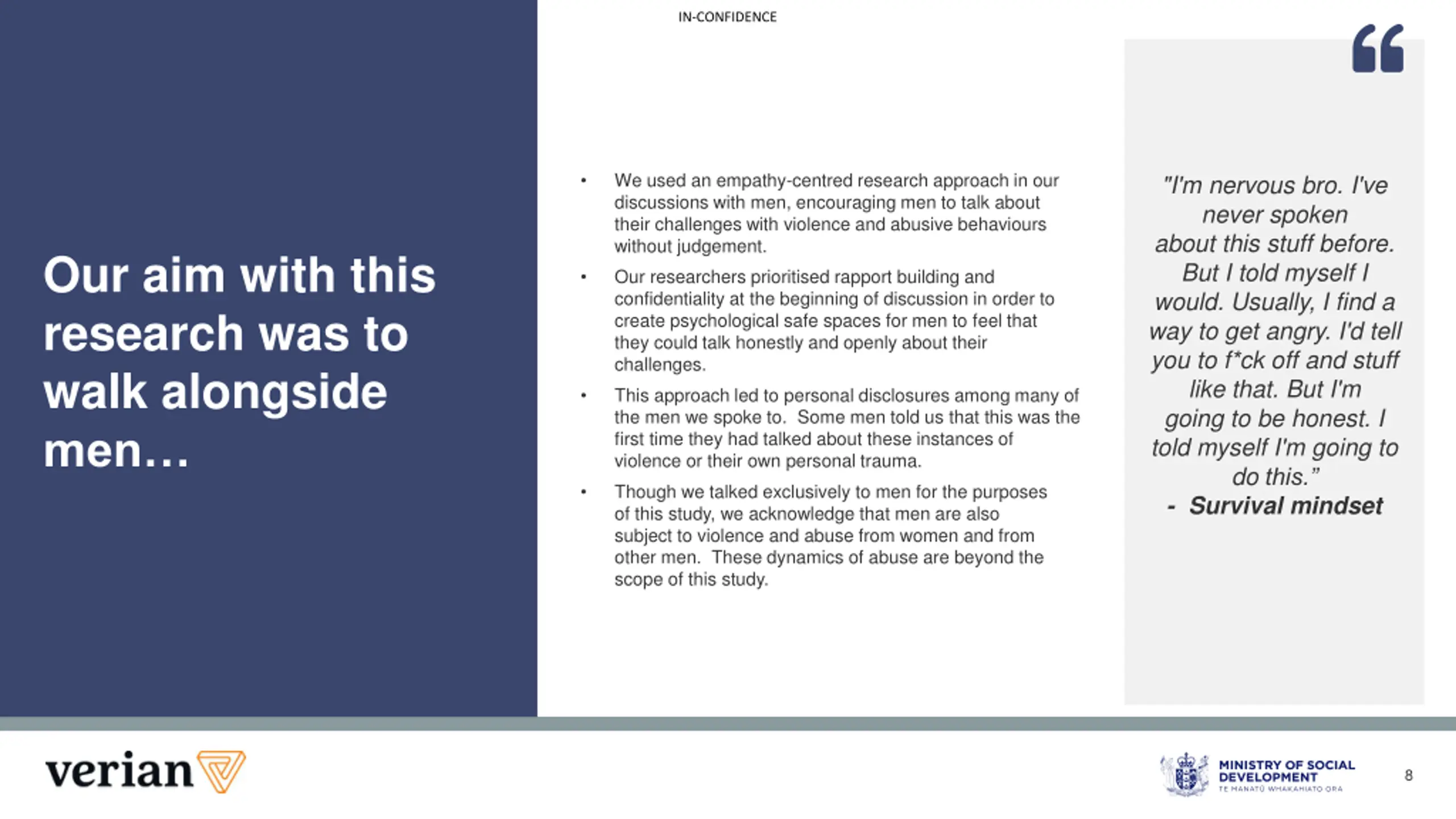 - IN-CONFIDENCE We used an empathy-centred research approach in our discussions with men, encouraging men to talk about their challenges with violence and abusive behaviours without judgement. "I'm nervous bro. I've never spoken about this stuff before. But I told myself I would. Usually, I find a way to get angry. I'd tell you to f*ck off and stuff like that. But I'm going to be honest. I told myself I'm going to do this. - Survival mindset Our aim with this research was to walk alongside men Our researchers prioritised rapport building and confidentiality at the beginning of discussion in order to create psychological safe spaces for men to feel that they could talk honestly and openly about their challenges. This approach led to personal disclosures among many of the men we spoke to. Some men told us that this was the first time they had talked about these instances of violence or their own personal trauma. Though we talked exclusively to men for the purposes of this study, we acknowledge that men are also subject to violence and abuse from women and from other men. These dynamics of abuse are beyond the scope of this study. 8