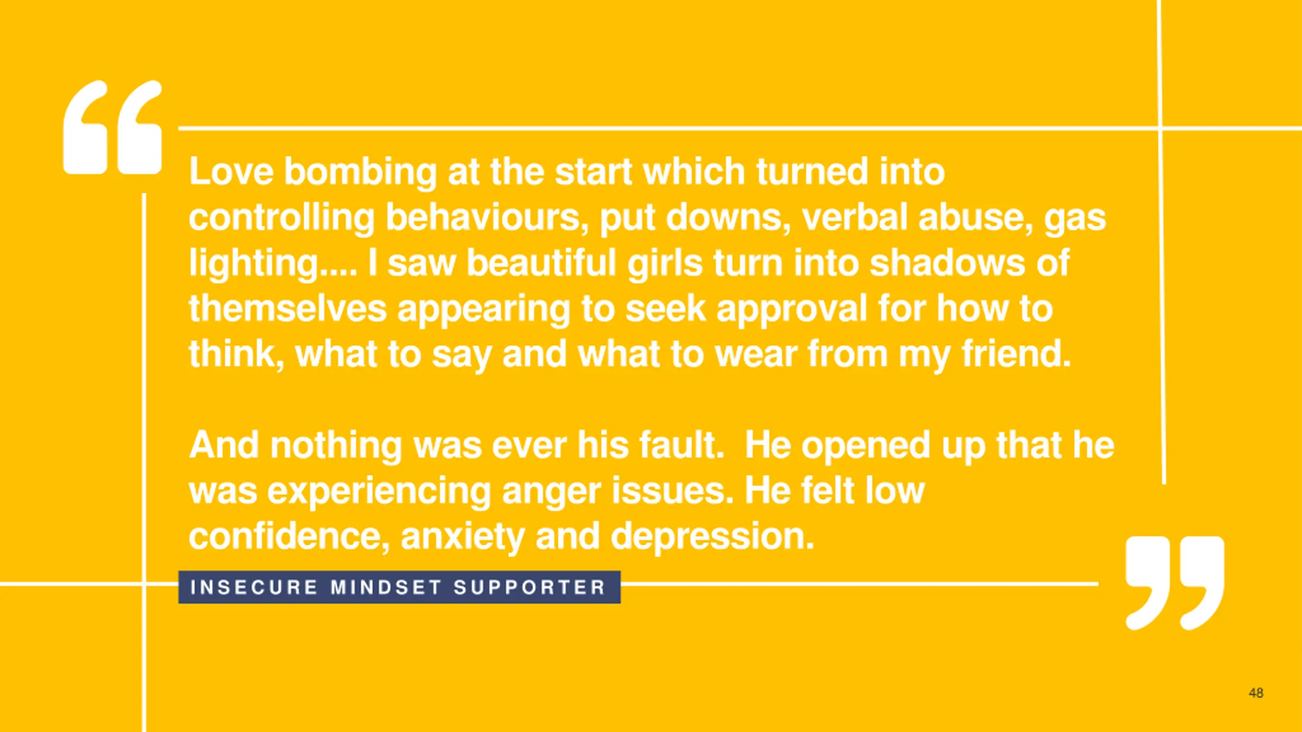 - IN-CONFIDENCE Love bombing at the start which turned into controlling behaviours, put downs, verbal abuse, gas lighting.... I saw beautiful girls turn into shadows of themselves appearing to seek approval for how to think, what to say and what to wear from my friend. And nothing was ever his fault. He opened up that he was experiencing anger issues. He felt low confidence, anxiety and depression. I N S E C U R E M I N D S E T S U P P O R T E R 48 48