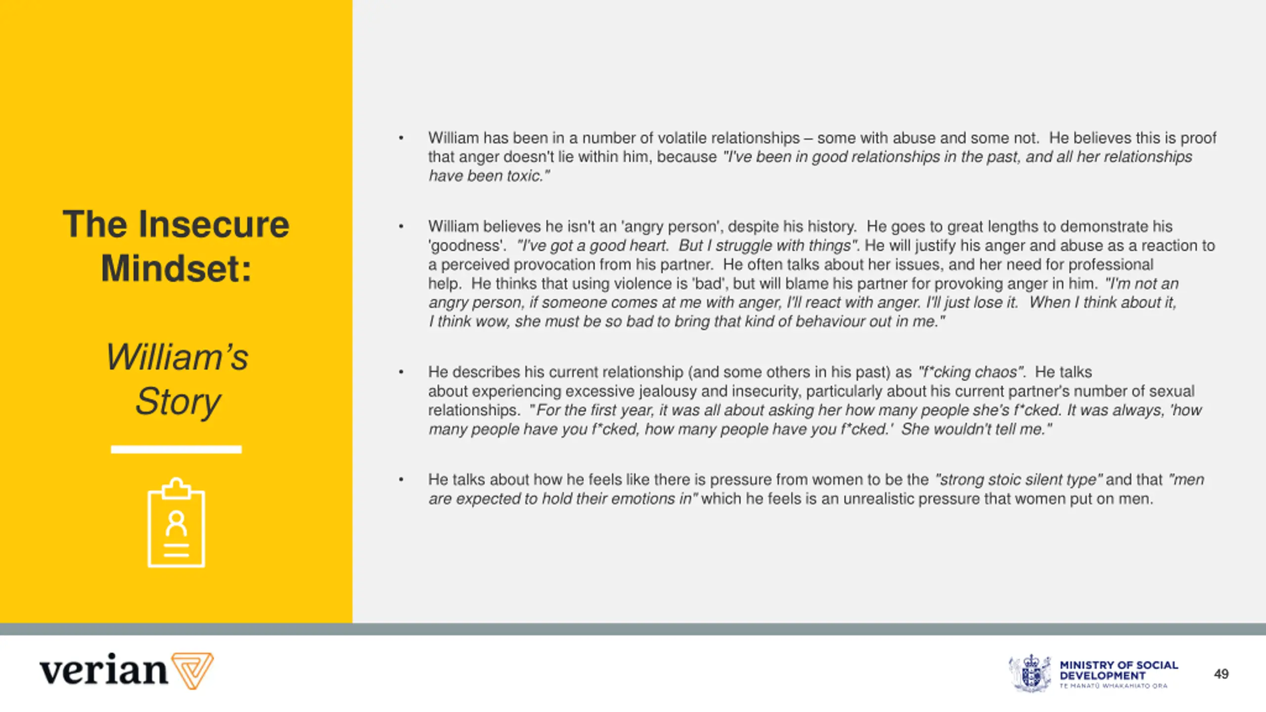 - IN-CONFIDENCE William has been in a number of volatile relationships some with abuse and some not. He believes this is proof that anger doesn't lie within him, because "I've been in good relationships in the past, and all her relationships have been toxic." The Insecure Mindset: William believes he isn't an 'angry person', despite his history. He goes to great lengths to demonstrate his 'goodness'. "I've got a good heart. But I struggle with things". He will justify his anger and abuse as a reaction to a perceived provocation from his partner. He often talks about her issues, and her need for professional help. He thinks that using violence is 'bad', but will blame his partner for provoking anger in him. "I'm not an angry person, if someone comes at me with anger, I'll react with anger. I'll just lose it. When I think about it, I think wow, she must be so bad to bring that kind of behaviour out in me." William s Story He describes his current relationship (and some others in his past) as "f*cking chaos". He talks about experiencing excessive jealousy and insecurity, particularly about his current partner's number of sexual relationships. "For the first year, it was all about asking her how many people she's f*cked. It was always, 'how many people have you f*cked, how many people have you f*cked.' She wouldn't tell me." He talks about how he feels like there is pressure from women to be the "strong stoic silent type" and that "men are expected to hold their emotions in" which he feels is an unrealistic pressure that women put on men. 49 49