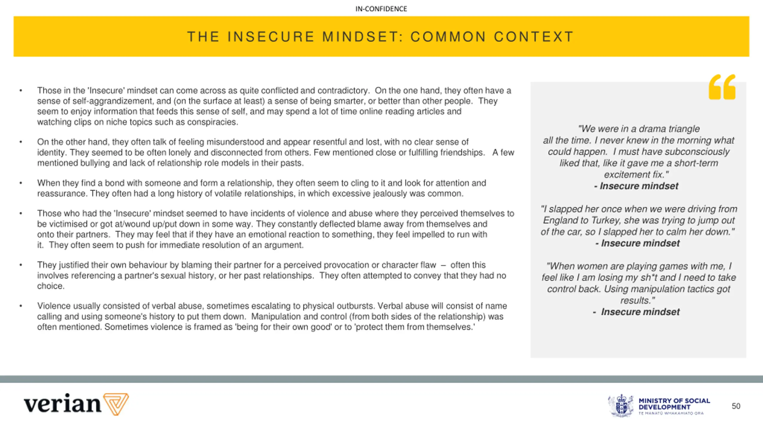 - IN-CONFIDENCE THE INSECURE MINDSET: COMMON CONTEXT Those in the 'Insecure' mindset can come across as quite conflicted and contradictory. On the one hand, they often have a sense of self-aggrandizement, and (on the surface at least) a sense of being smarter, or better than other people. They seem to enjoy information that feeds this sense of self, and may spend a lot of time online reading articles and watching clips on niche topics such as conspiracies. "We were in a drama triangle all the time. I never knew in the morning what could happen. I must have subconsciously liked that, like it gave me a short-term excitement fix." - Insecure mindset On the other hand, they often talk of feeling misunderstood and appear resentful and lost, with no clear sense of identity. They seemed to be often lonely and disconnected from others. Few mentioned close or fulfilling friendships. A few mentioned bullying and lack of relationship role models in their pasts. When they find a bond with someone and form a relationship, they often seem to cling to it and look for attention and reassurance. They often had a long history of volatile relationships, in which excessive jealously was common. "I slapped her once when we were driving from England to Turkey, she was trying to jump out of the car, so I slapped her to calm her down." - Insecure mindset Those who had the 'Insecure' mindset seemed to have incidents of violence and abuse where they perceived themselves to be victimised or got at/wound up/put down in some way. They constantly deflected blame away from themselves and onto their partners. They may feel that if they have an emotional reaction to something, they feel impelled to run with it. They often seem to push for immediate resolution of an argument. They justified their own behaviour by blaming their partner for a perceived provocation or character flaw often this involves referencing a partner's sexual history, or her past relationships. They often attempted to convey that they had no choice. "When women are playing games with me, I feel like I am losing my sh*t and I need to take control back. Using manipulation tactics got results." - Insecure mindset Violence usually consisted of verbal abuse, sometimes escalating to physical outbursts. Verbal abuse will consist of name calling and using someone's history to put them down. Manipulation and control (from both sides of the relationship) was often mentioned. Sometimes violence is framed as 'being for their own good' or to 'protect them from themselves.' 50