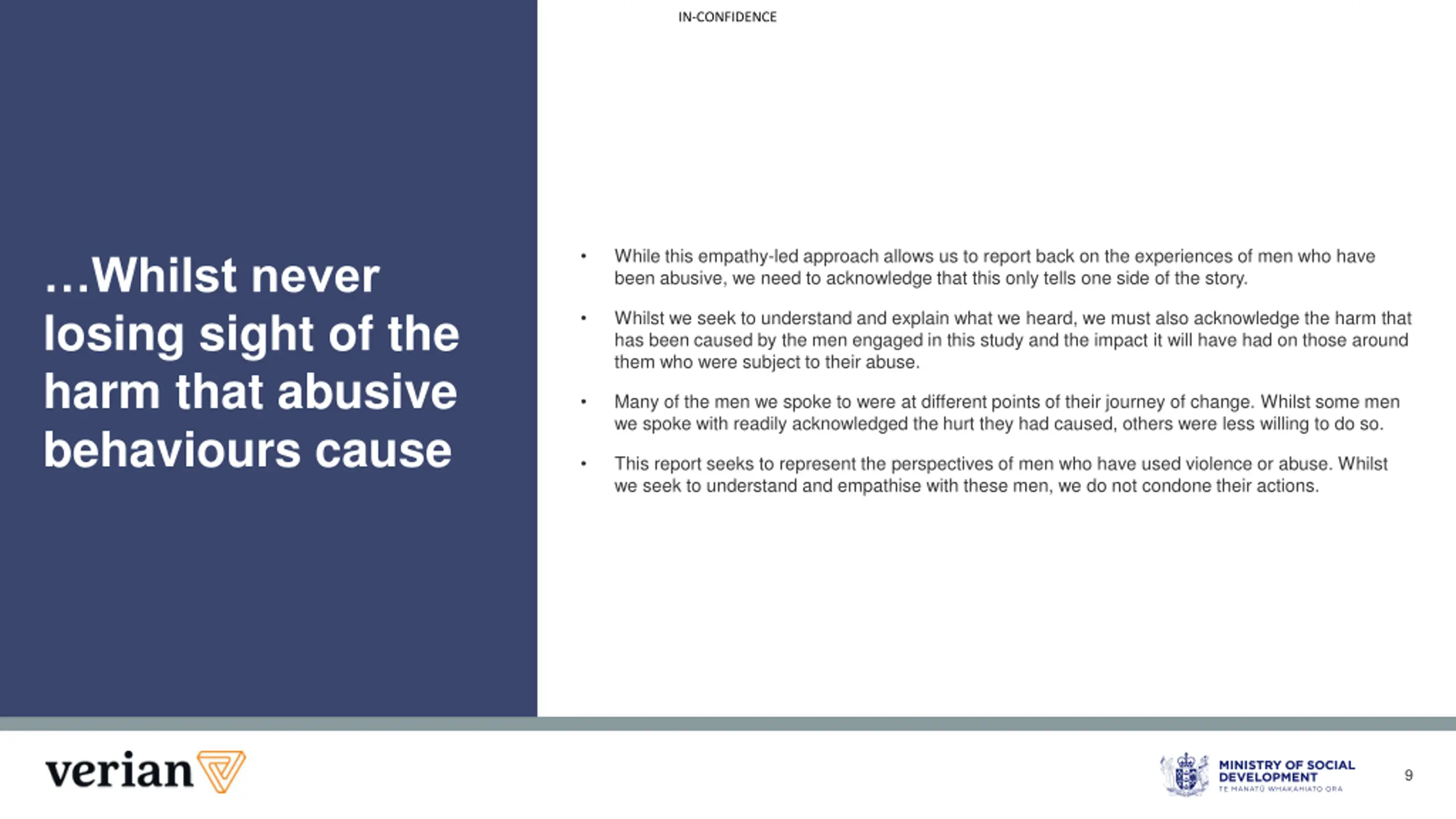 - IN-CONFIDENCE While this empathy-led approach allows us to report back on the experiences of men who have been abusive, we need to acknowledge that this only tells one side of the story. Whilst never losing sight of the harm that abusive behaviours cause Whilst we seek to understand and explain what we heard, we must also acknowledge the harm that has been caused by the men engaged in this study and the impact it will have had on those around them who were subject to their abuse. Many of the men we spoke to were at different points of their journey of change. Whilst some men we spoke with readily acknowledged the hurt they had caused, others were less willing to do so. This report seeks to represent the perspectives of men who have used violence or abuse. Whilst we seek to understand and empathise with these men, we do not condone their actions. 9