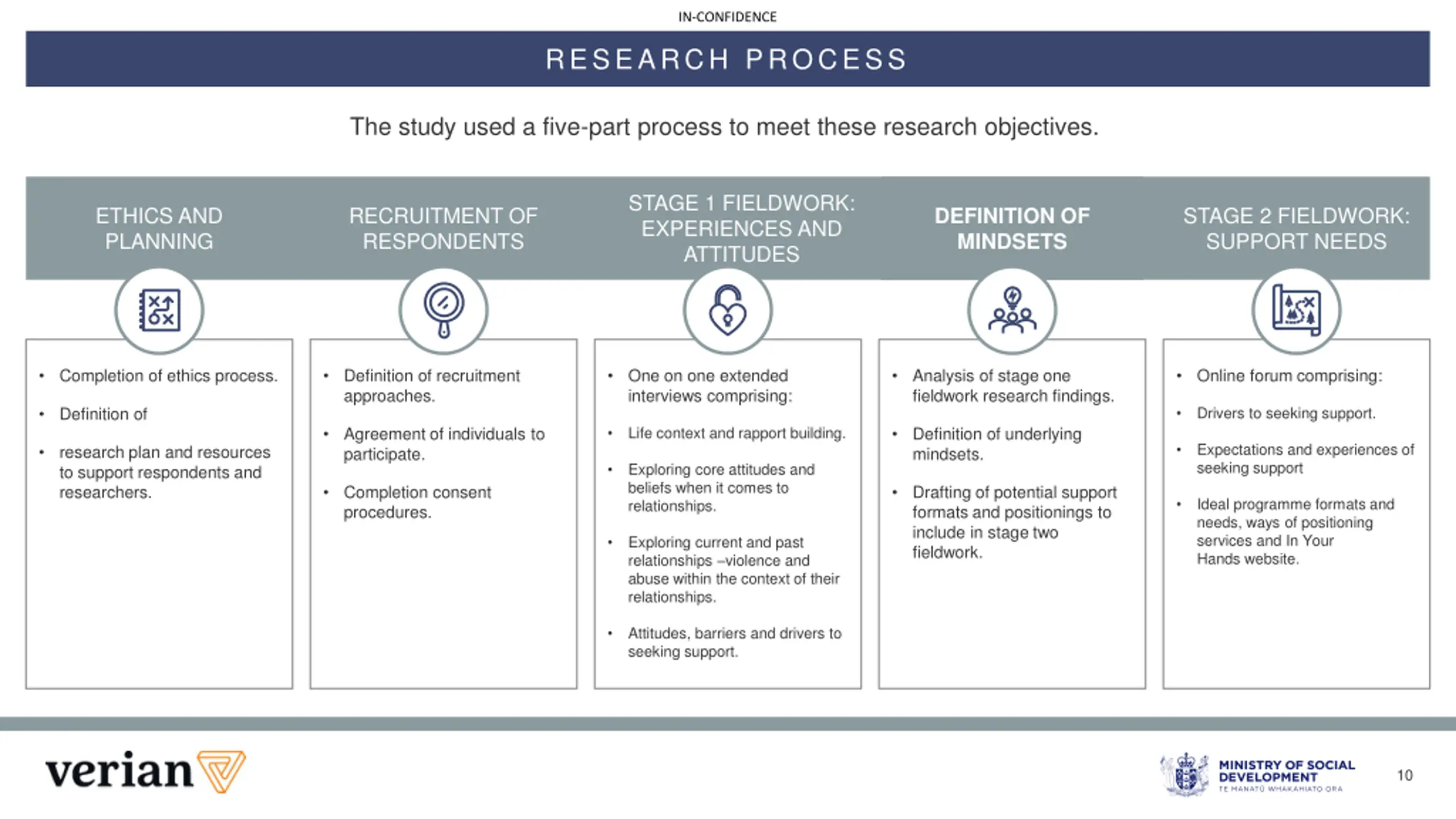 - IN-CONFIDENCE RESEARCH PROCESS The study used a five-part process to meet these research objectives. STAGE 1 FIELDWORK: EXPERIENCES AND ATTITUDES ETHICS AND PLANNING RECRUITMENT OF RESPONDENTS STAGE 2 FIELDWORK: SUPPORT NEEDS DEFINITION OF MINDSETS Completion of ethics process. Definition of recruitment approaches. One on one extended interviews comprising: Analysis of stage one fieldwork research findings. Online forum comprising: Definition of Drivers to seeking support. Agreement of individuals to participate. Definition of underlying mindsets. Life context and rapport building. Expectations and experiences of seeking support research plan and resources to support respondents and researchers. Exploring core attitudes and beliefs when it comes to relationships. Completion consent procedures. Drafting of potential support formats and positionings to include in stage two fieldwork. Ideal programme formats and needs, ways of positioning services and In Your Hands website. Exploring current and past relationships violence and abuse within the context of their relationships. Attitudes, barriers and drivers to seeking support. 10