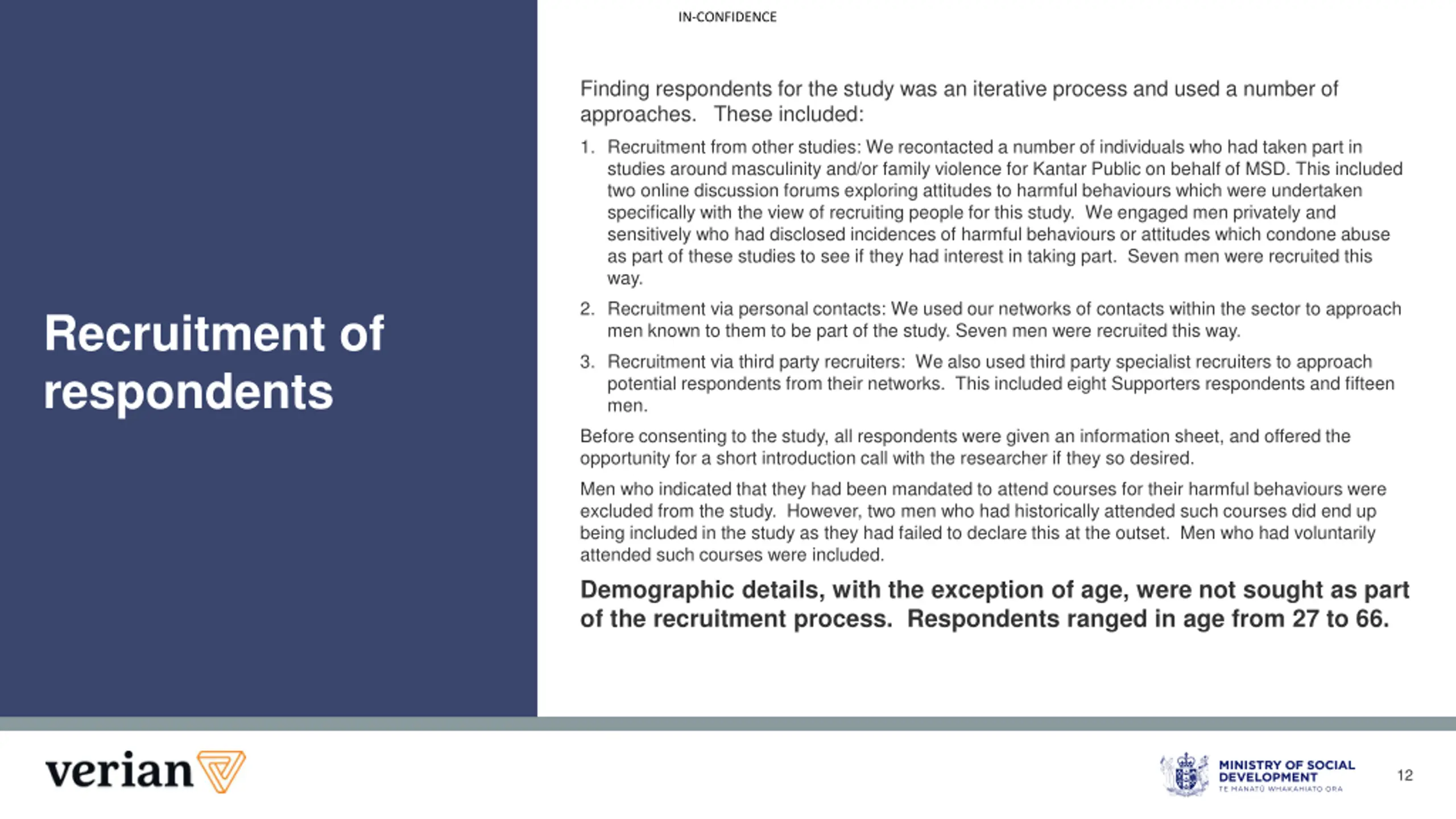- IN-CONFIDENCE Finding respondents for the study was an iterative process and used a number of approaches. These included: 1. Recruitment from other studies: We recontacted a number of individuals who had taken part in studies around masculinity and/or family violence for Kantar Public on behalf of MSD. This included two online discussion forums exploring attitudes to harmful behaviours which were undertaken specifically with the view of recruiting people for this study. We engaged men privately and sensitively who had disclosed incidences of harmful behaviours or attitudes which condone abuse as part of these studies to see if they had interest in taking part. Seven men were recruited this way. 2. Recruitment via personal contacts: We used our networks of contacts within the sector to approach men known to them to be part of the study. Seven men were recruited this way. Recruitment of respondents 3. Recruitment via third party recruiters: We also used third party specialist recruiters to approach potential respondents from their networks. This included eight Supporters respondents and fifteen men. Before consenting to the study, all respondents were given an information sheet, and offered the opportunity for a short introduction call with the researcher if they so desired. Men who indicated that they had been mandated to attend courses for their harmful behaviours were excluded from the study. However, two men who had historically attended such courses did end up being included in the study as they had failed to declare this at the outset. Men who had voluntarily attended such courses were included. Demographic details, with the exception of age, were not sought as part of the recruitment process. Respondents ranged in age from 27 to 66. 12