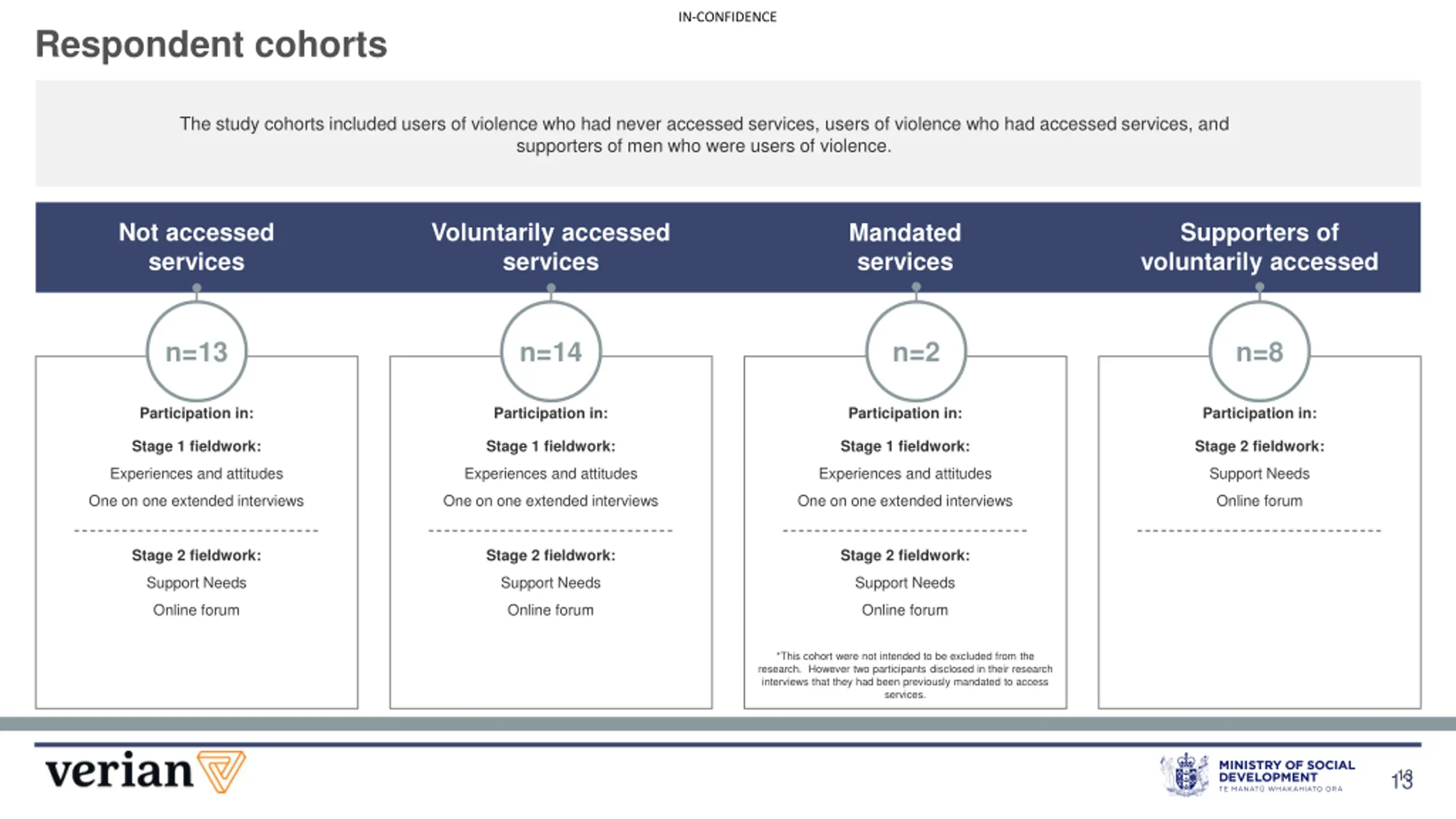 - IN-CONFIDENCE Respondent cohorts The study cohorts included users of violence who had never accessed services, users of violence who had accessed services, and supporters of men who were users of violence. Not accessed services Voluntarily accessed services Supporters of voluntarily accessed Mandated services n=13 n=14 n=2 n=8 Participation in: Participation in: Participation in: Participation in: Stage 1 fieldwork: Stage 1 fieldwork: Stage 1 fieldwork: Stage 2 fieldwork: Experiences and attitudes Experiences and attitudes Experiences and attitudes Support Needs One on one extended interviews One on one extended interviews One on one extended interviews Online forum Stage 2 fieldwork: Stage 2 fieldwork: Stage 2 fieldwork: Support Needs Support Needs Support Needs Online forum Online forum Online forum *This cohort were not intended to be excluded from the research. However two participants disclosed in their research interviews that they had been previously mandated to access services. 13 13