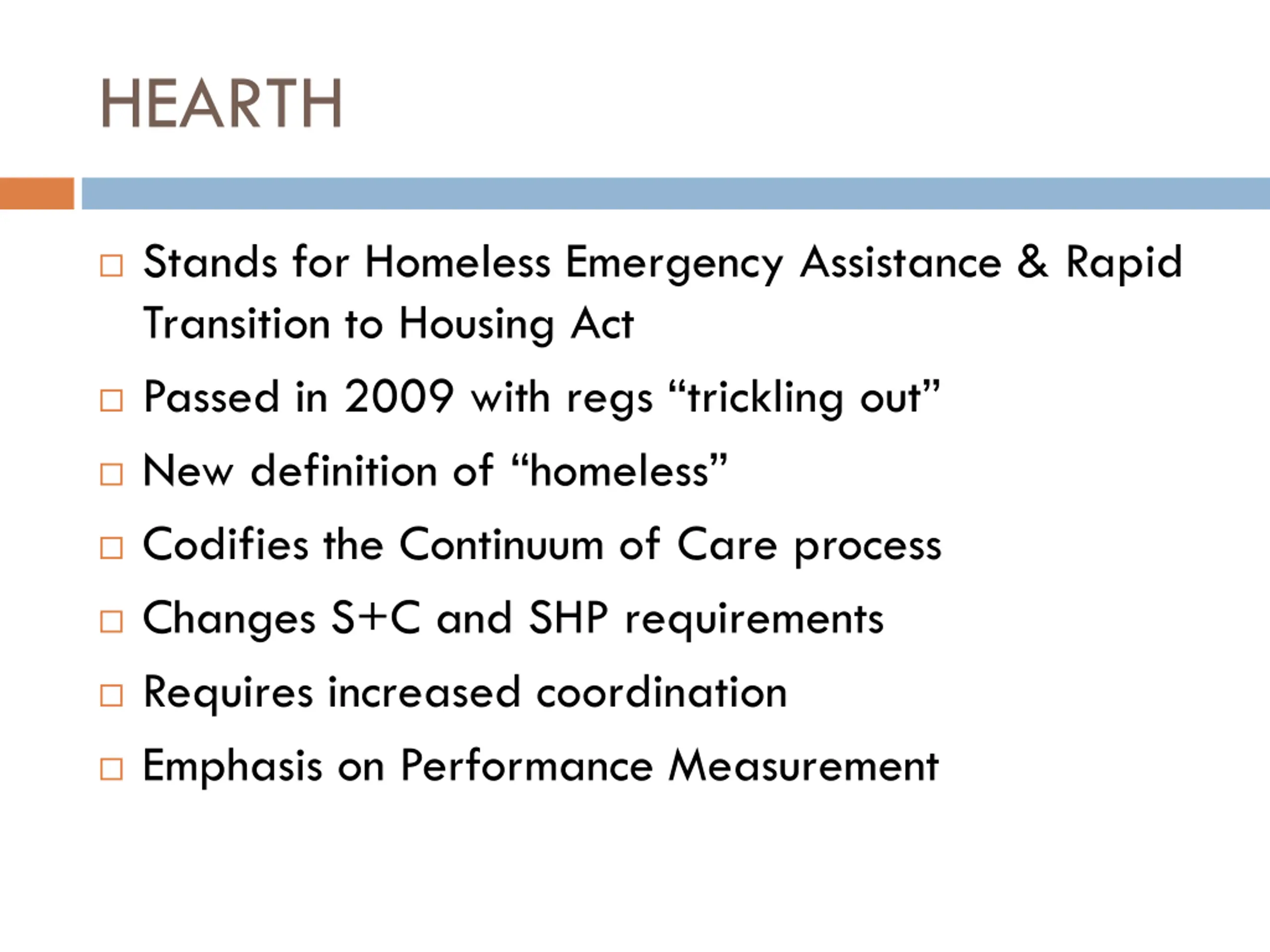 HEARTH Stands for Homeless Emergency Assistance & Rapid Transition to Housing Act Passed in 2009 with regs trickling out New definition of homeless Codifies the Continuum of Care process Changes S+C and SHP requirements Requires increased coordination Emphasis on Performance Measurement