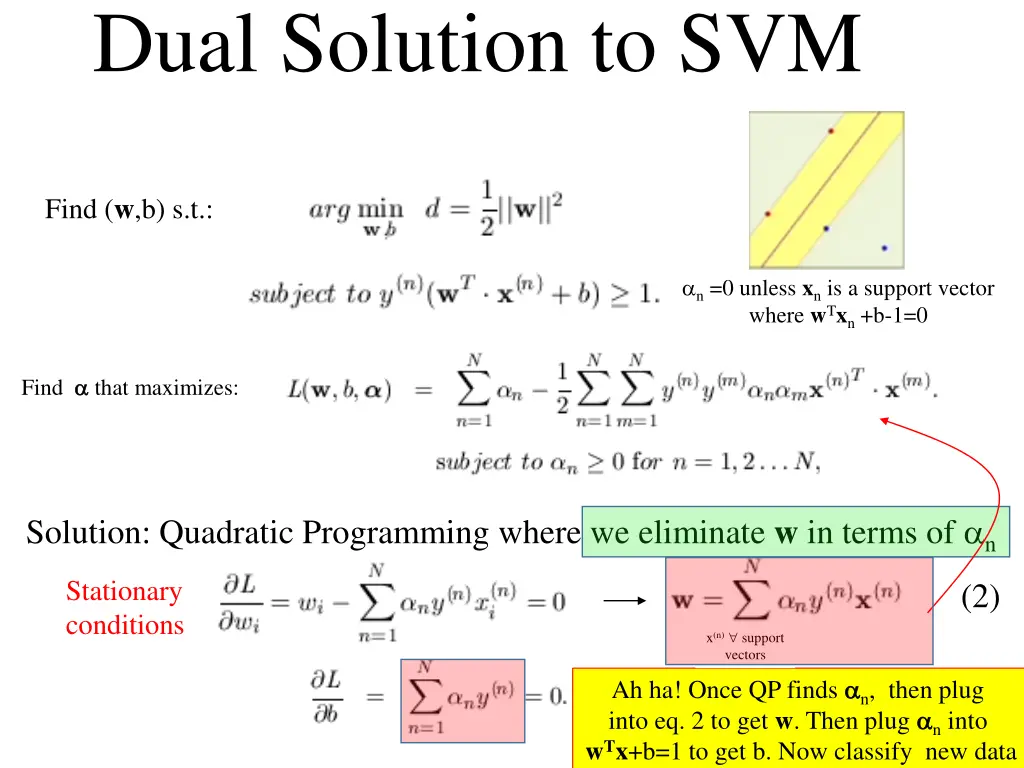 Support Vector Machine Support Vector Machine Dual Solution to SVM Find n s.t.: Correlation matrix=Dot products between x(n) and x(m) NxN Matrix! Yikes, N=#feature vectors. QP needs O(N3) to solve Hold everything! QP needs O(N3) to solve abone NxN matrix (N=# feature vectors) while the original primal problem only required Dx1 vector (w,b) costing O(M3). But D<<<N so sounds like a horrible strategy unless D>>N. Well, D>>>N if we are solving non-linear (w,b) with high dimension, such as kernel method.