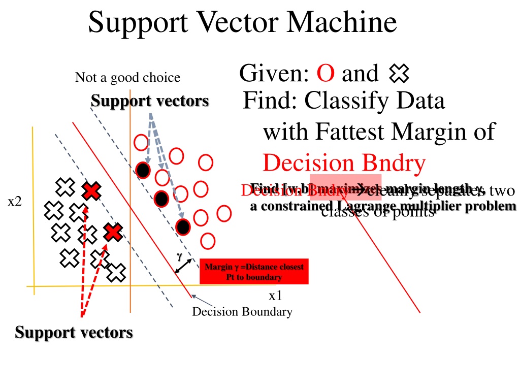 Support Vector Machine Support Vector Machine Support Vector Machine Given: O and Find: Classify Data with Fattest Margin of Decision BndryBest separator Find [w,b] maximizes margin length , a constrained Lagrange multiplier problem classes of points Not a good choice Support vectors Decision Bndry cleanly separates two x2 Margin =Distance closest Pt to boundary x1 Decision Boundary Support vectors