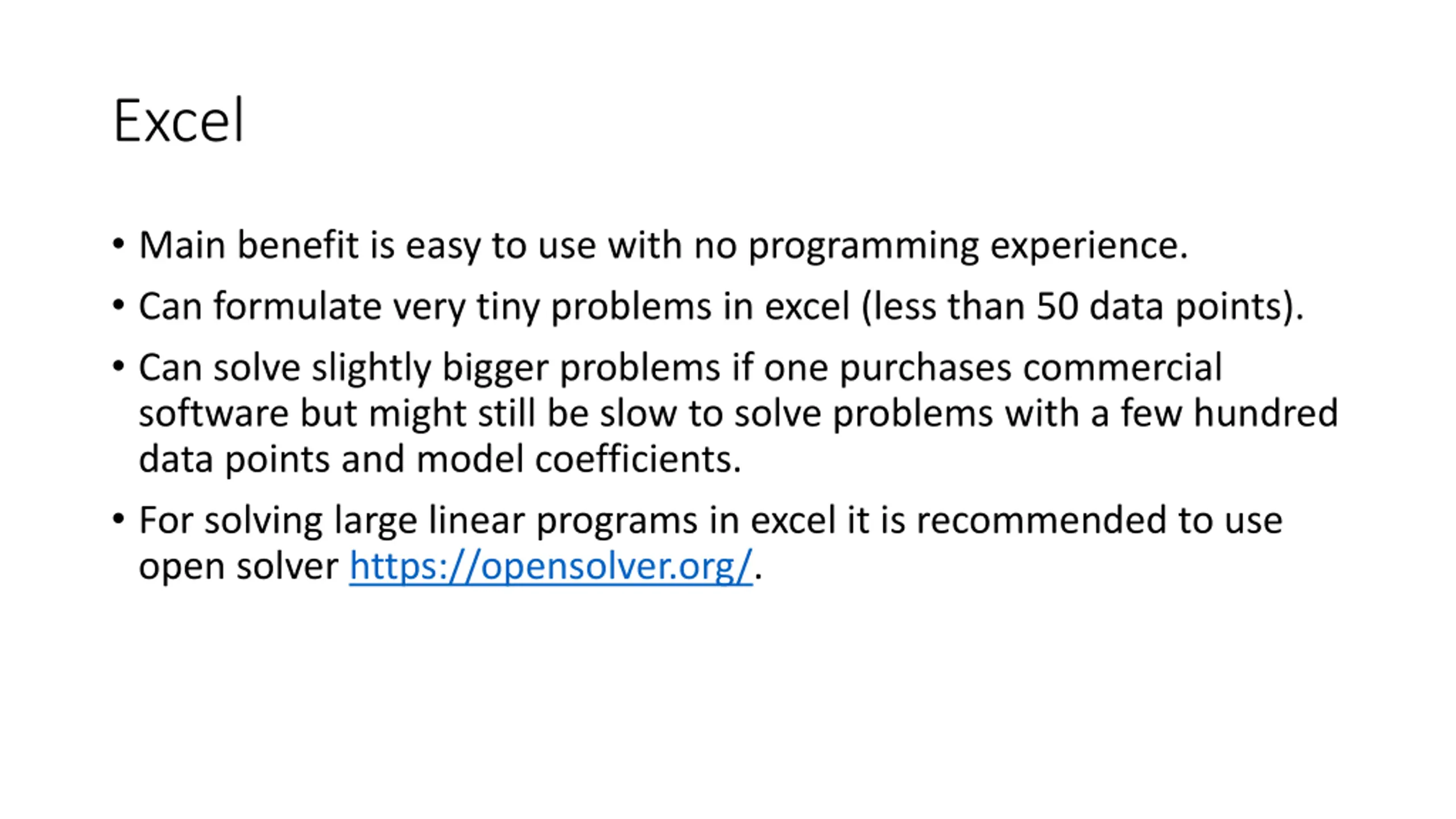 Excel Main benefit is easy to use with no programming experience. Can formulate very tiny problems in excel (less than 50 data points). Can solve slightly bigger problems if one purchases commercial software but might still be slow to solve problems with a few hundred data points and model coefficients. For solving large linear programs in excel it is recommended to use open solver https://opensolver.org/.