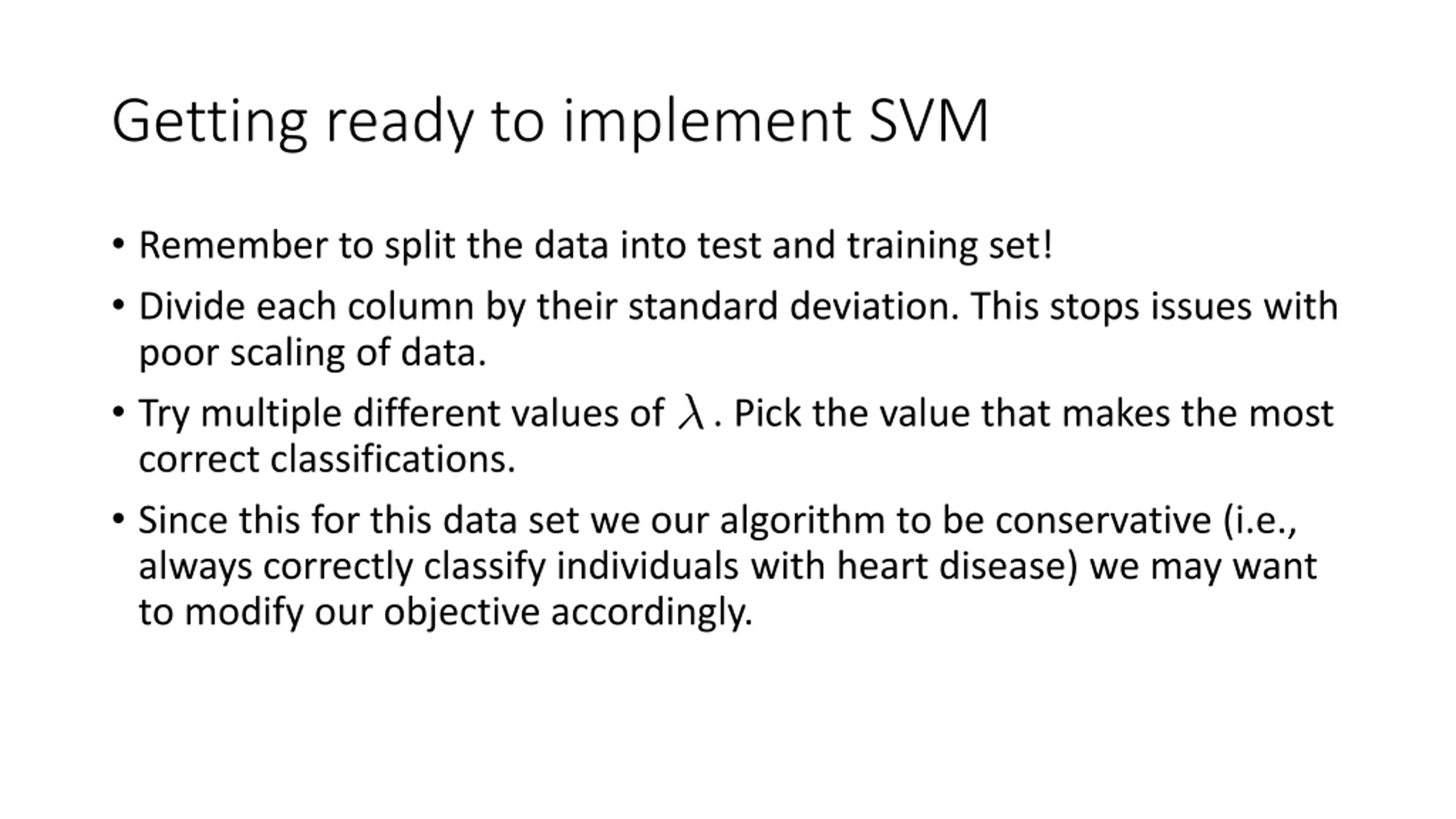 Getting ready to implement SVM Remember to split the data into test and training set! Divide each column by their standard deviation. This stops issues with poor scaling of data. Try multiple different values of . Pick the value that makes the most correct classifications. Since this for this data set we our algorithm to be conservative (i.e., always correctly classify individuals with heart disease) we may want to modify our objective accordingly.