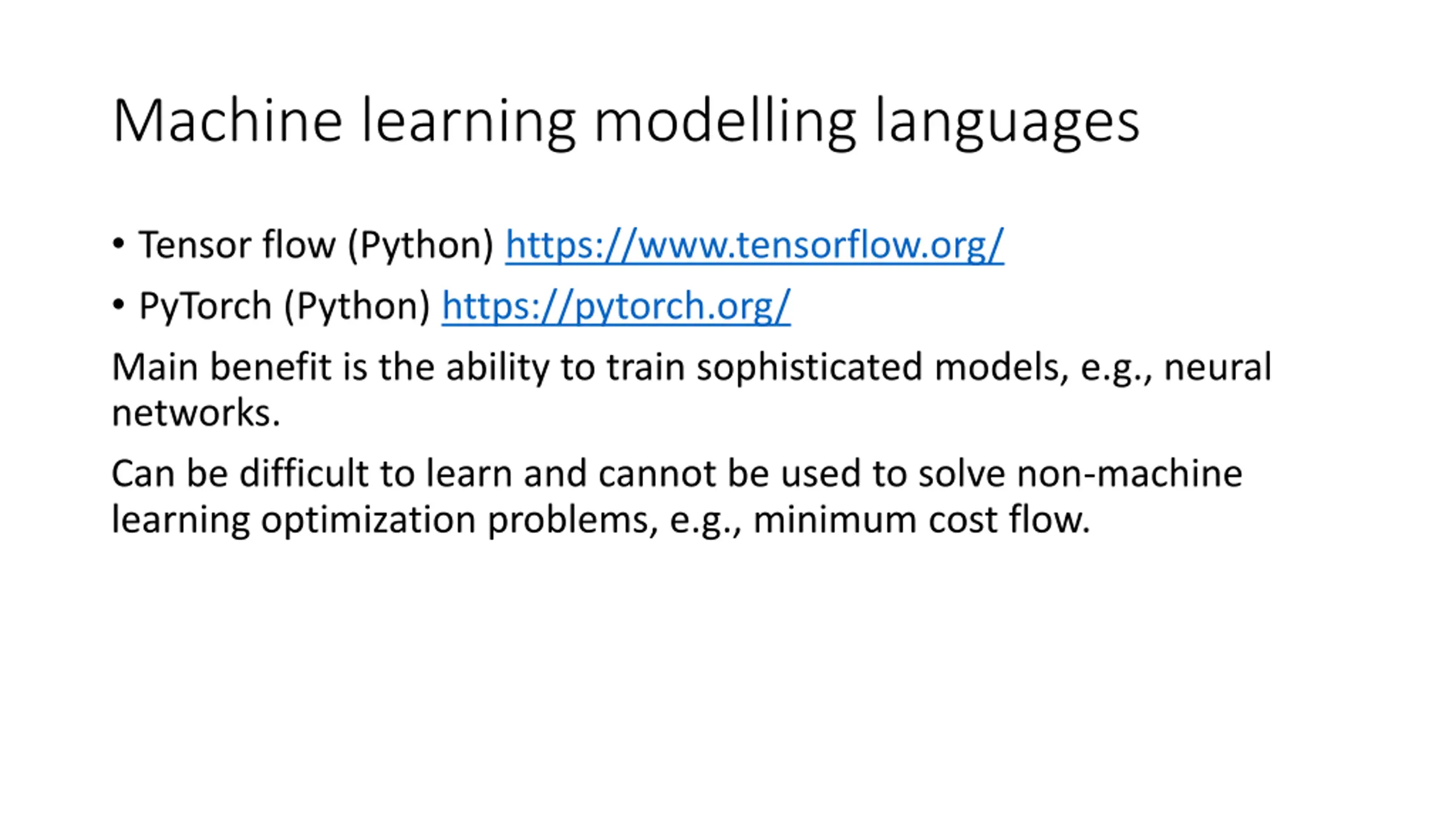 Machine learning modelling languages Tensor flow (Python) https://www.tensorflow.org/ PyTorch (Python) https://pytorch.org/ Main benefit is the ability to train sophisticated models, e.g., neural networks. Can be difficult to learn and cannot be used to solve non-machine learning optimization problems, e.g., minimum cost flow.