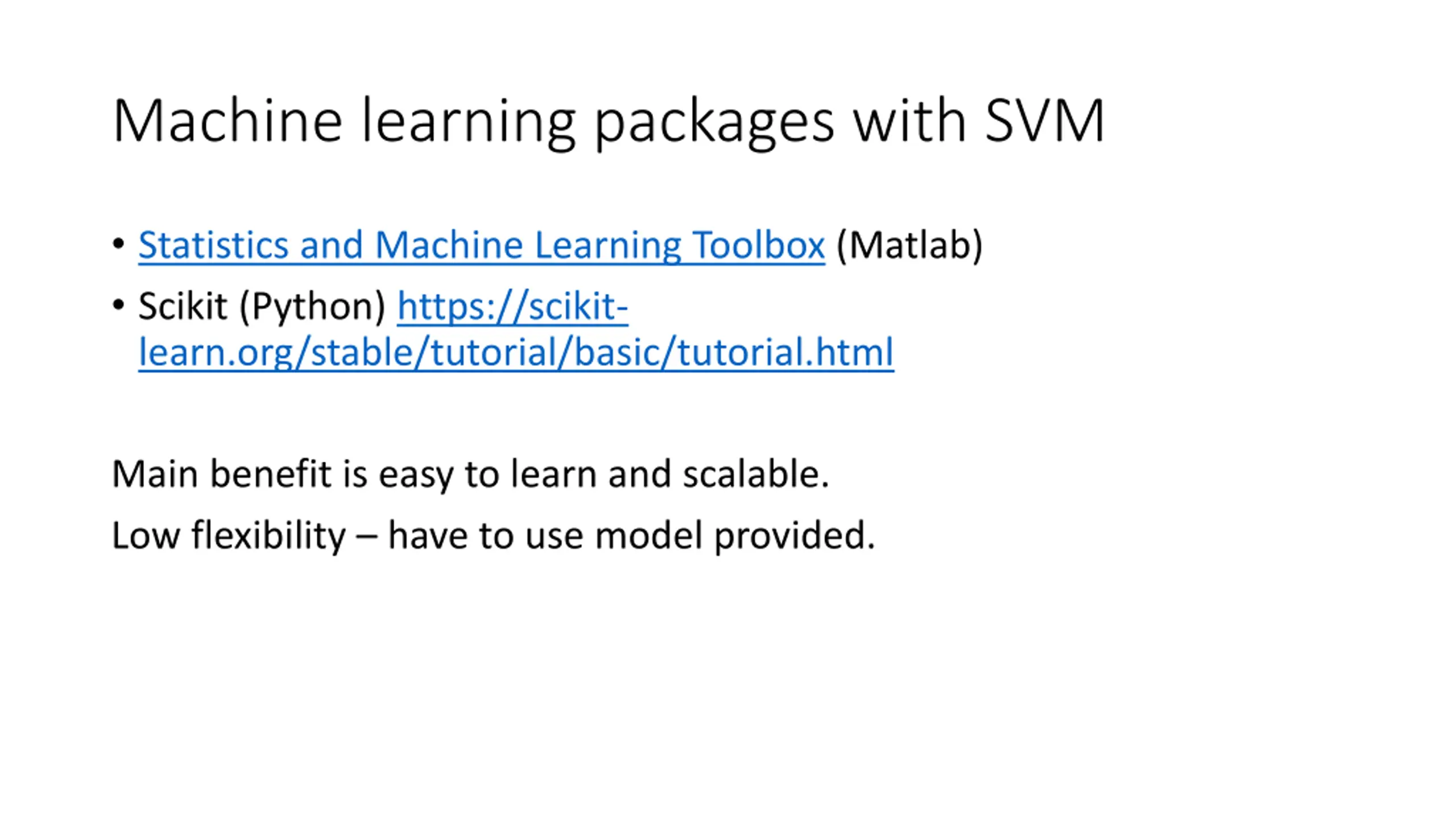 Machine learning packages with SVM Statistics and Machine Learning Toolbox (Matlab) Scikit (Python) https://scikit- learn.org/stable/tutorial/basic/tutorial.html Main benefit is easy to learn and scalable. Low flexibility have to use model provided.