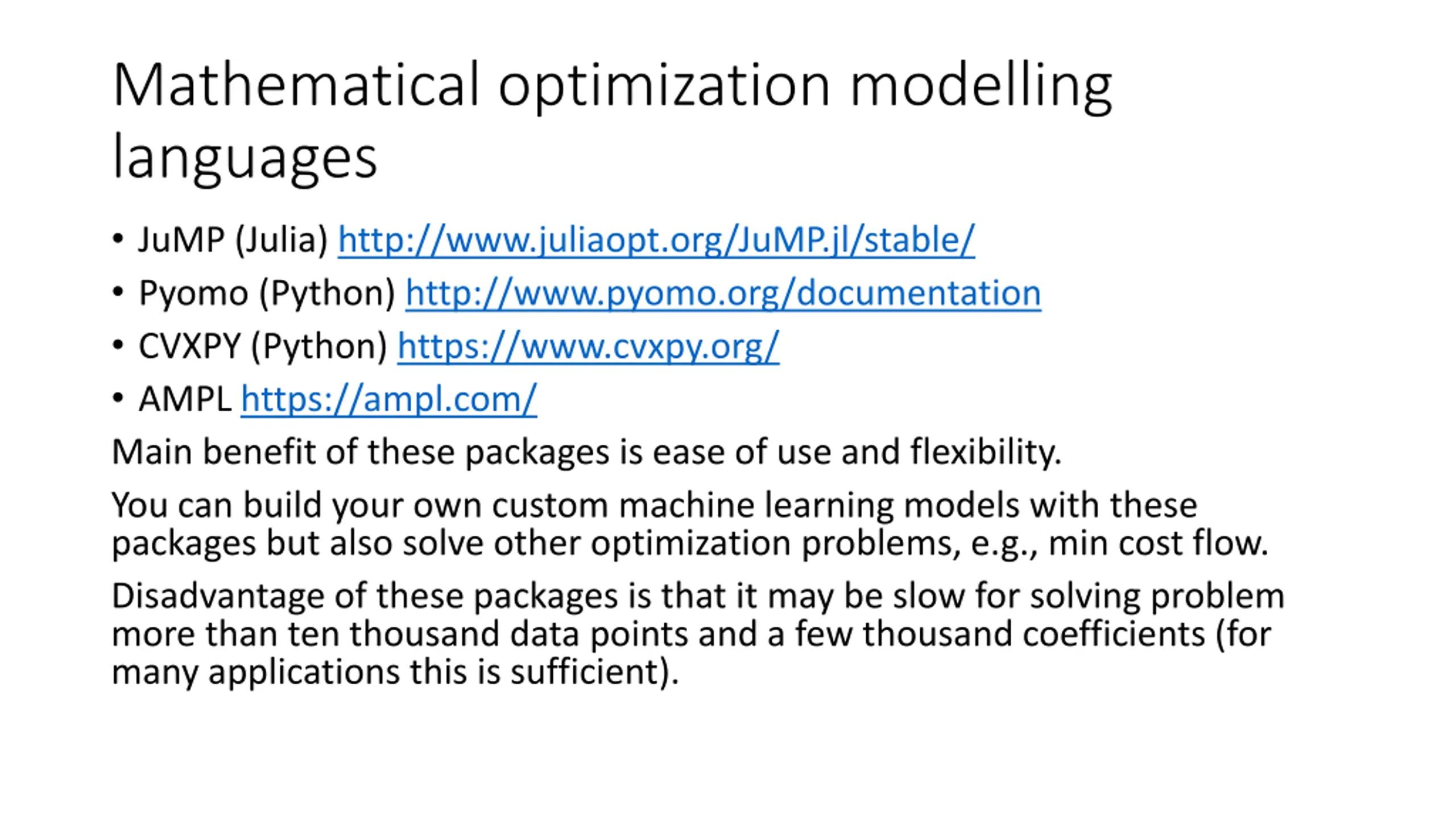 Mathematical optimization modelling languages JuMP (Julia) http://www.juliaopt.org/JuMP.jl/stable/ Pyomo (Python) http://www.pyomo.org/documentation CVXPY (Python) https://www.cvxpy.org/ AMPL https://ampl.com/ Main benefit of these packages is ease of use and flexibility. You can build your own custom machine learning models with these packages but also solve other optimization problems, e.g., min cost flow. Disadvantage of these packages is that it may be slow for solving problem more than ten thousand data points and a few thousand coefficients (for many applications this is sufficient).