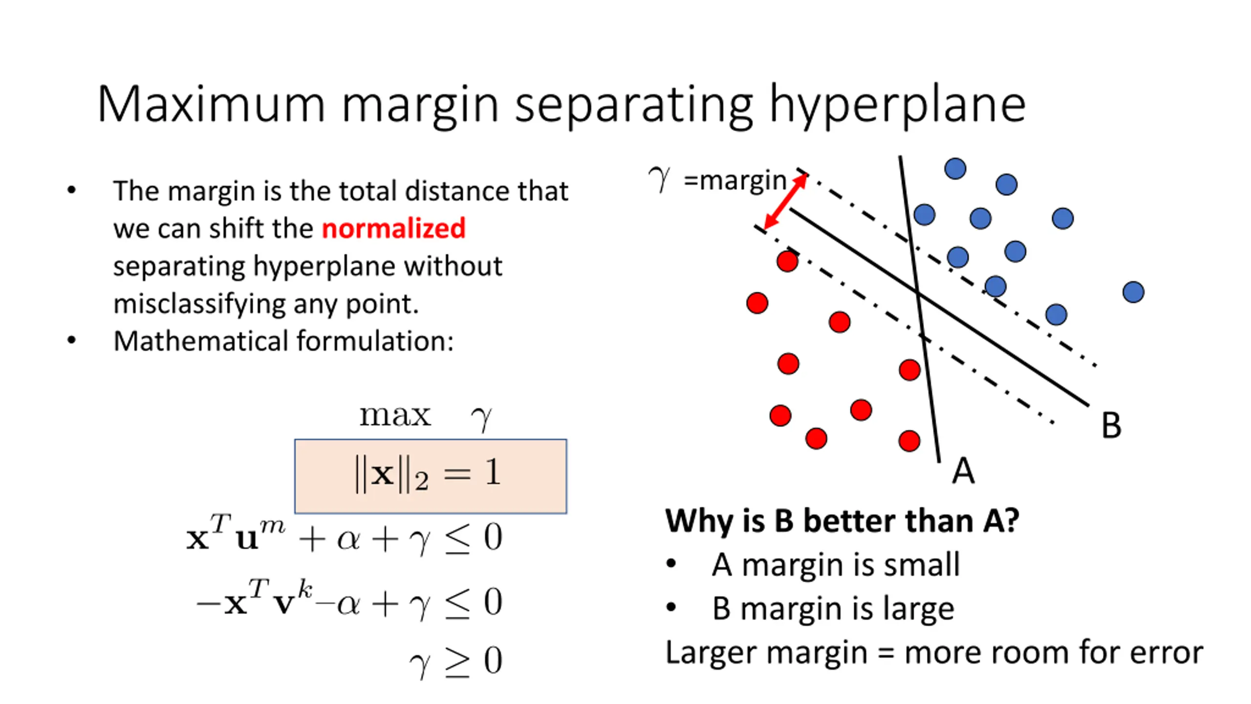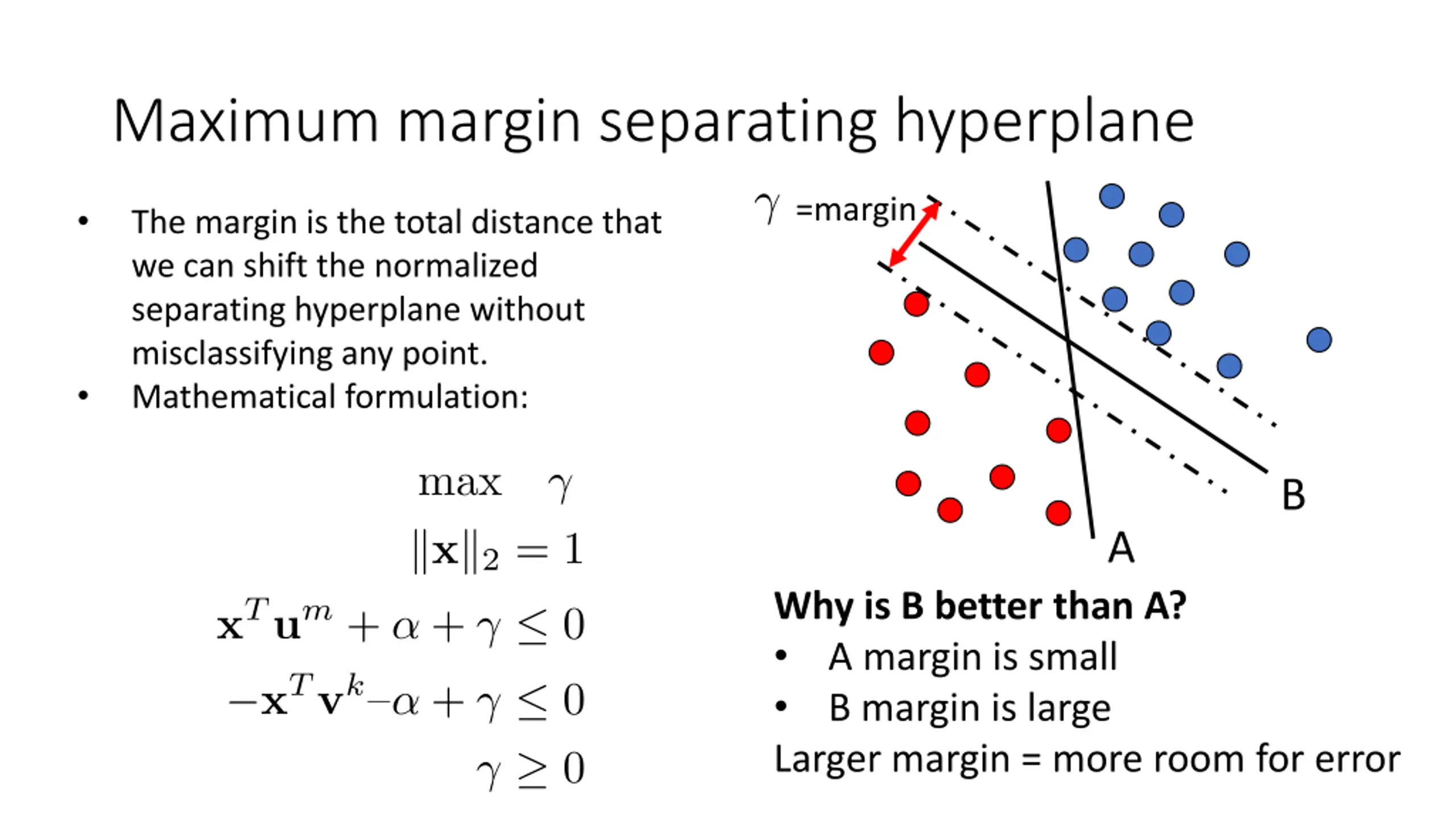 Maximum margin separating hyperplane =margin The margin is the total distance that we can shift the normalized separating hyperplane without misclassifying any point. Mathematical formulation: B A Why is B better than A? A margin is small B margin is large Larger margin = more room for error