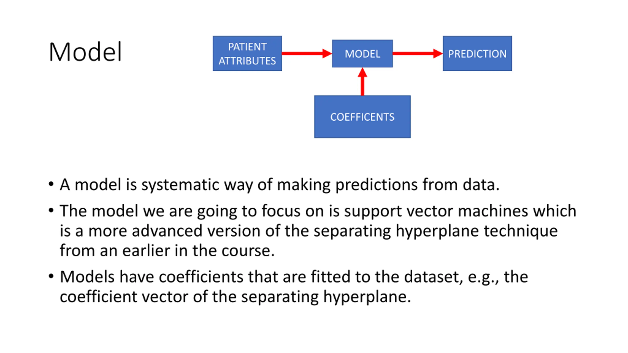 Model PATIENT ATTRIBUTES MODEL PREDICTION COEFFICENTS A model is systematic way of making predictions from data. The model we are going to focus on is support vector machines which is a more advanced version of the separating hyperplane technique from an earlier in the course. Models have coefficients that are fitted to the dataset, e.g., the coefficient vector of the separating hyperplane.