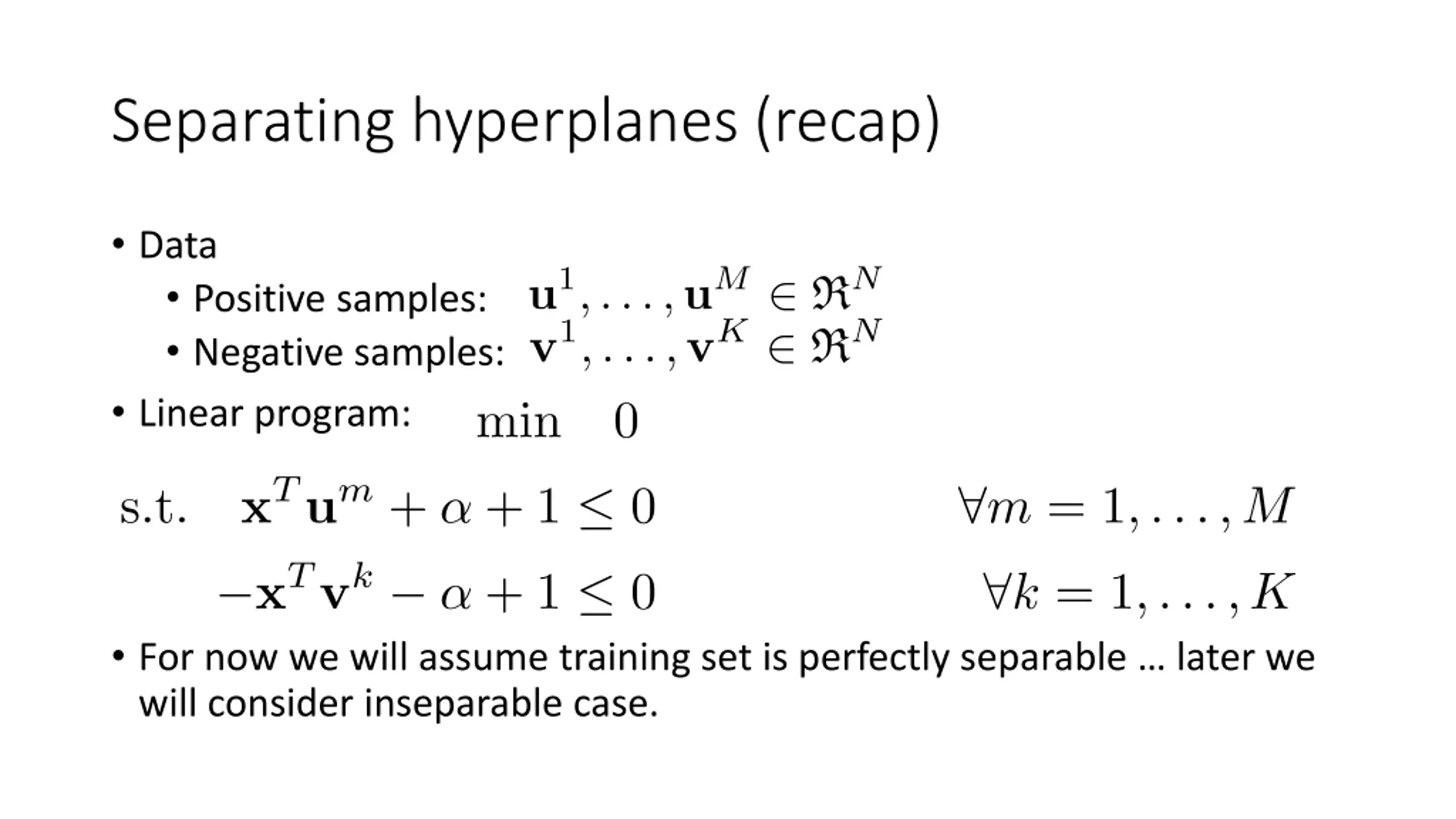 Separating hyperplanes (recap) Data Positive samples: Negative samples: Linear program: For now we will assume training set is perfectly separable later we will consider inseparable case.