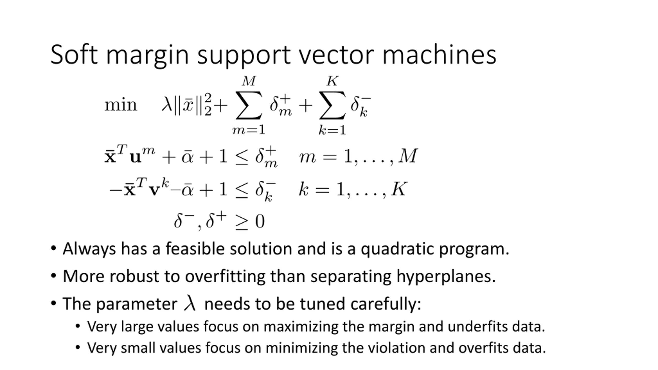 Soft margin support vector machines Always has a feasible solution and is a quadratic program. More robust to overfitting than separating hyperplanes. The parameter needs to be tuned carefully: Very large values focus on maximizing the margin and underfits data. Very small values focus on minimizing the violation and overfits data.