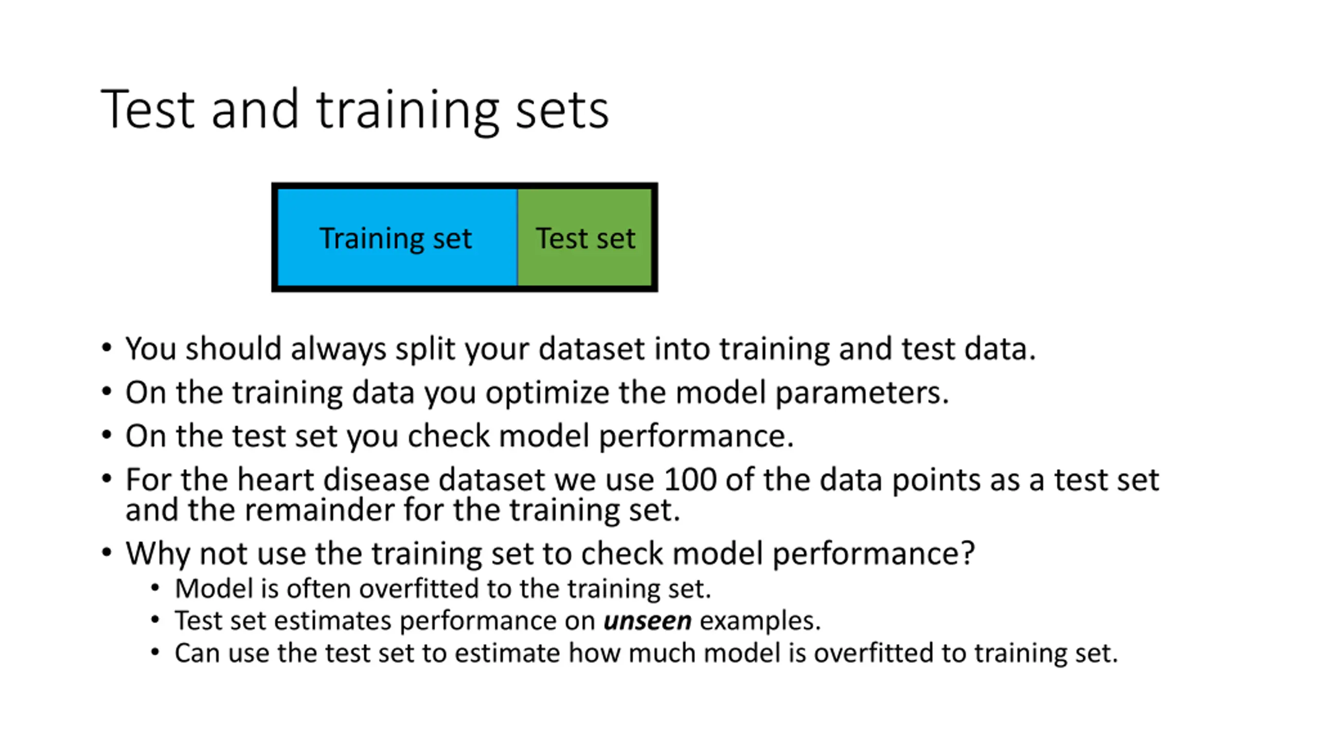 Test and training sets Training set Test set You should always split your dataset into training and test data. On the training data you optimize the model parameters. On the test set you check model performance. For the heart disease dataset we use 100 of the data points as a test set and the remainder for the training set. Why not use the training set to check model performance? Model is often overfitted to the training set. Test set estimates performance on unseen examples. Can use the test set to estimate how much model is overfitted to training set.