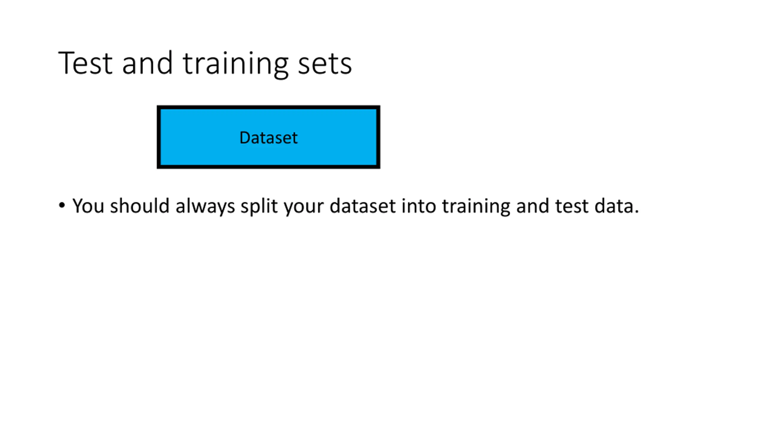 Test and training sets Dataset You should always split your dataset into training and test data.