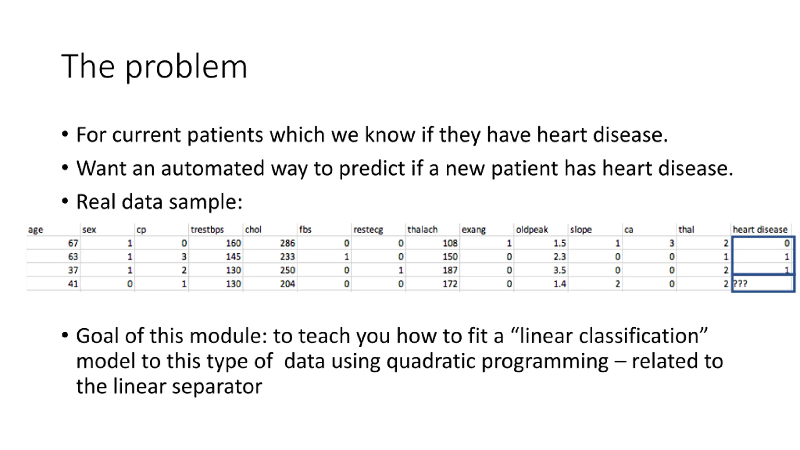 The problem For current patients which we know if they have heart disease. Want an automated way to predict if a new patient has heart disease. Real data sample: Goal of this module: to teach you how to fit a linear classification model to this type of data using quadratic programming related to the linear separator