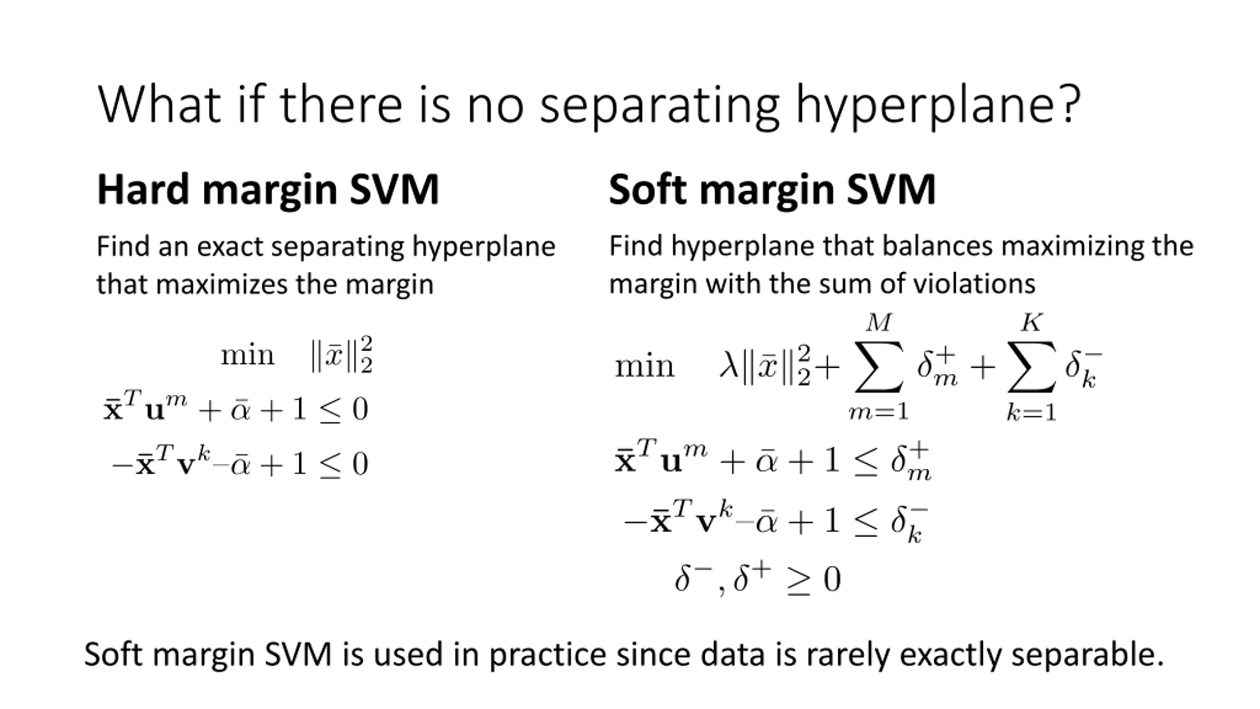 What if there is no separating hyperplane? Hard margin SVM Soft margin SVM Find hyperplane that balances maximizing the margin with the sum of violations Find an exact separating hyperplane that maximizes the margin Soft margin SVM is used in practice since data is rarely exactly separable.