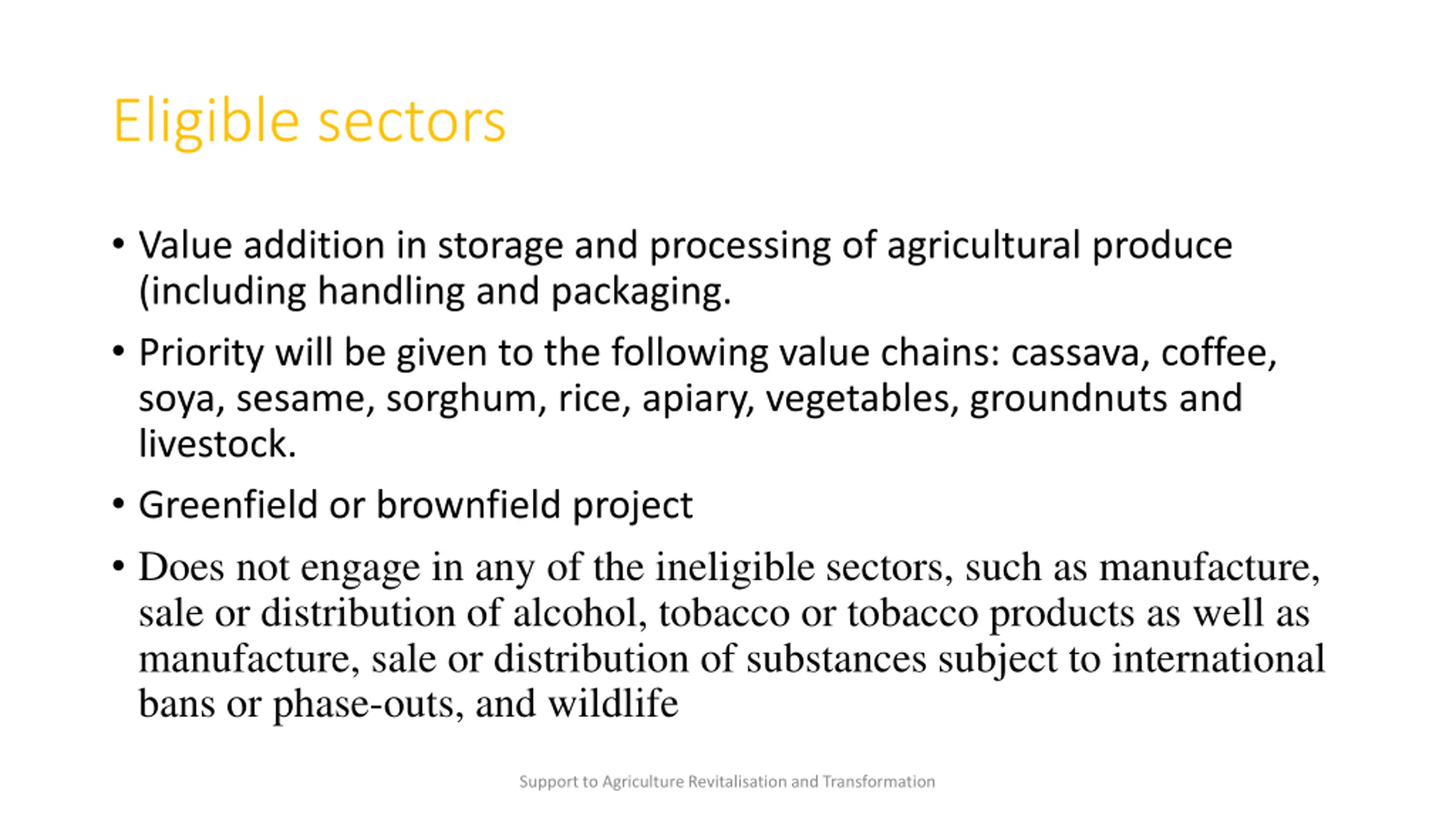 Eligible sectors Value addition in storage and processing of agricultural produce (including handling and packaging. Priority will be given to the following value chains: cassava, coffee, soya, sesame, sorghum, rice, apiary, vegetables, groundnuts and livestock. Greenfield or brownfield project Does not engage in any of the ineligible sectors, such as manufacture, sale or distribution of alcohol, tobacco or tobacco products as well as manufacture, sale or distribution of substances subject to international bans or phase-outs, and wildlife Support to Agriculture Revitalisation and Transformation
