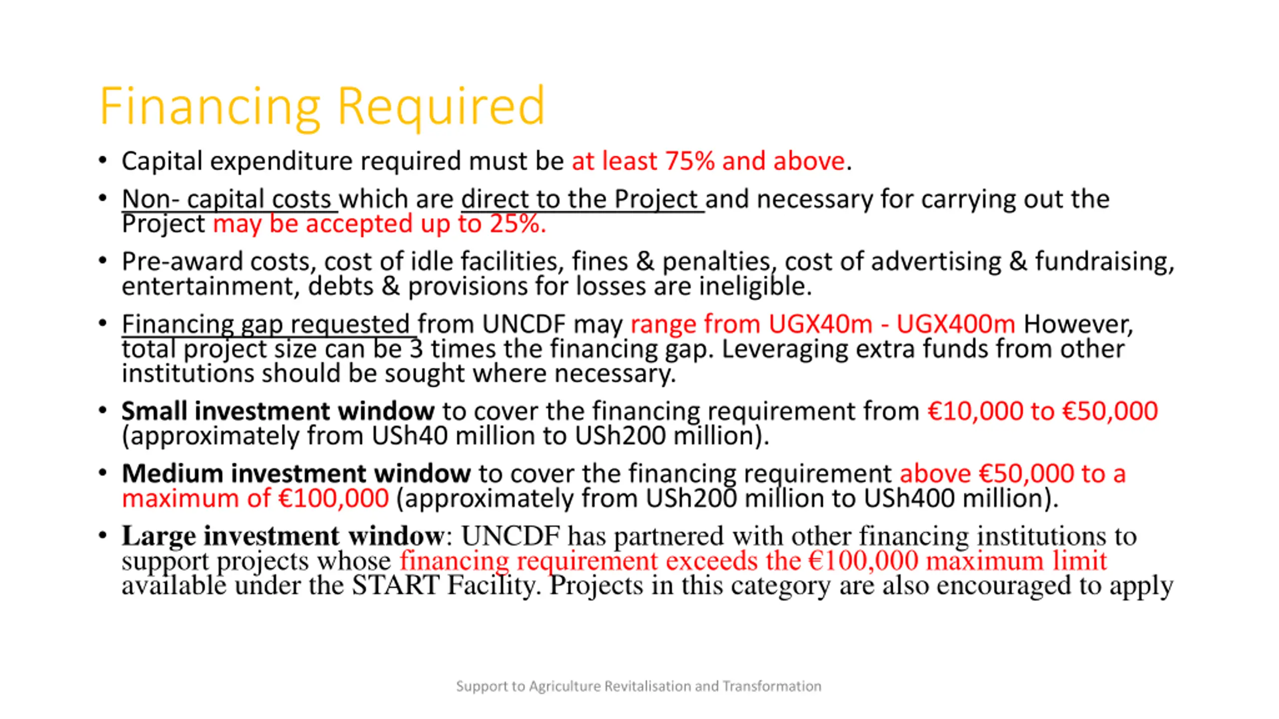 Financing Required Capital expenditure required must be at least 75% and above. Non- capital costs which are direct to the Project and necessary for carrying out the Project may be accepted up to 25%. Pre-award costs, cost of idle facilities, fines & penalties, cost of advertising & fundraising, entertainment, debts & provisions for losses are ineligible. Financing gap requested from UNCDF may range from UGX40m - UGX400m However, total project size can be 3 times the financing gap. Leveraging extra funds from other institutions should be sought where necessary. Small investment window to cover the financing requirement from 10,000 to 50,000 (approximately from USh40 million to USh200 million). Medium investment window to cover the financing requirement above 50,000 to a maximum of 100,000 (approximately from USh200 million to USh400 million). Large investment window: UNCDF has partnered with other financing institutions to support projects whose financing requirement exceeds the 100,000 maximum limit available under the START Facility. Projects in this category are also encouraged to apply Support to Agriculture Revitalisation and Transformation