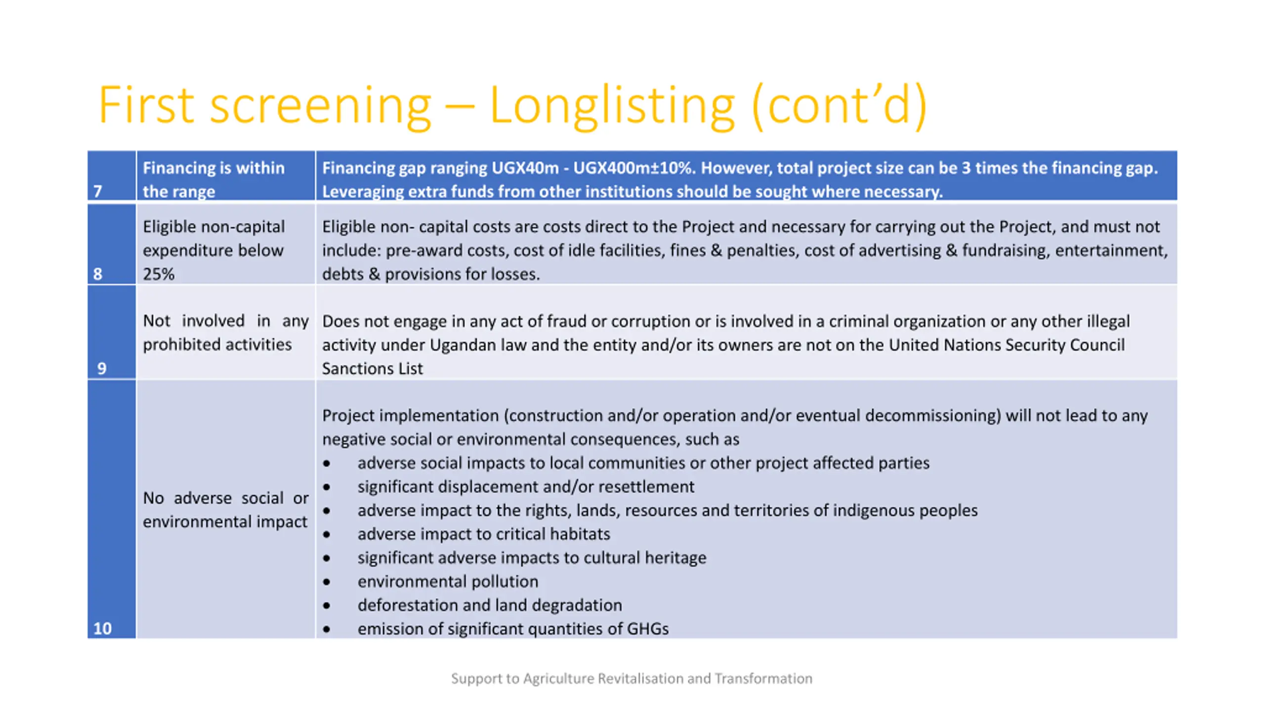 First screening Longlisting (contd) Financing is within the range Financing gap ranging UGX40m - UGX400m 10%. However, total project size can be 3 times the financing gap. Leveraging extra funds from other institutions should be sought where necessary. 7 Eligible non-capital expenditure below 25% Eligible non- capital costs are costs direct to the Project and necessary for carrying out the Project, and must not include: pre-award costs, cost of idle facilities, fines & penalties, cost of advertising & fundraising, entertainment, debts & provisions for losses. 8 Not involved in any prohibited activities Does not engage in any act of fraud or corruption or is involved in a criminal organization or any other illegal activity under Ugandan law and the entity and/or its owners are not on the United Nations Security Council Sanctions List 9 Project implementation (construction and/or operation and/or eventual decommissioning) will not lead to any negative social or environmental consequences, such as adverse social impacts to local communities or other project affected parties significant displacement and/or resettlement adverse impact to the rights, lands, resources and territories of indigenous peoples adverse impact to critical habitats significant adverse impacts to cultural heritage environmental pollution deforestation and land degradation emission of significant quantities of GHGs No adverse social or environmental impact 10 Support to Agriculture Revitalisation and Transformation