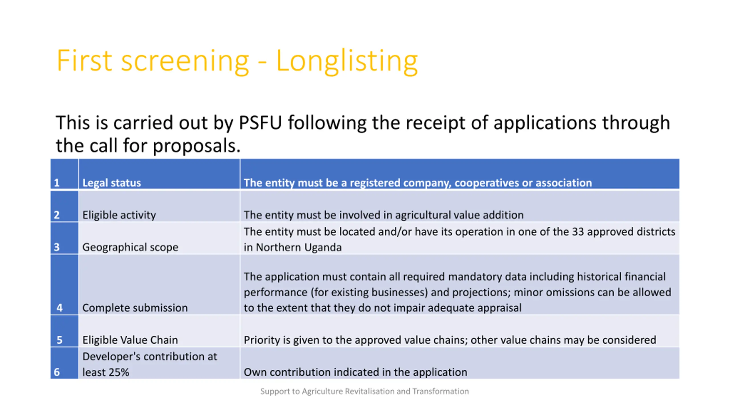 First screening - Longlisting This is carried out by PSFU following the receipt of applications through the call for proposals. 1 Legal status The entity must be a registered company, cooperatives or association 2 Eligible activity The entity must be involved in agricultural value addition The entity must be located and/or have its operation in one of the 33 approved districts in Northern Uganda 3 Geographical scope The application must contain all required mandatory data including historical financial performance (for existing businesses) and projections; minor omissions can be allowed to the extent that they do not impair adequate appraisal 4 Complete submission 5 Eligible Value Chain Developer's contribution at least 25% Priority is given to the approved value chains; other value chains may be considered 6 Own contribution indicated in the application Support to Agriculture Revitalisation and Transformation
