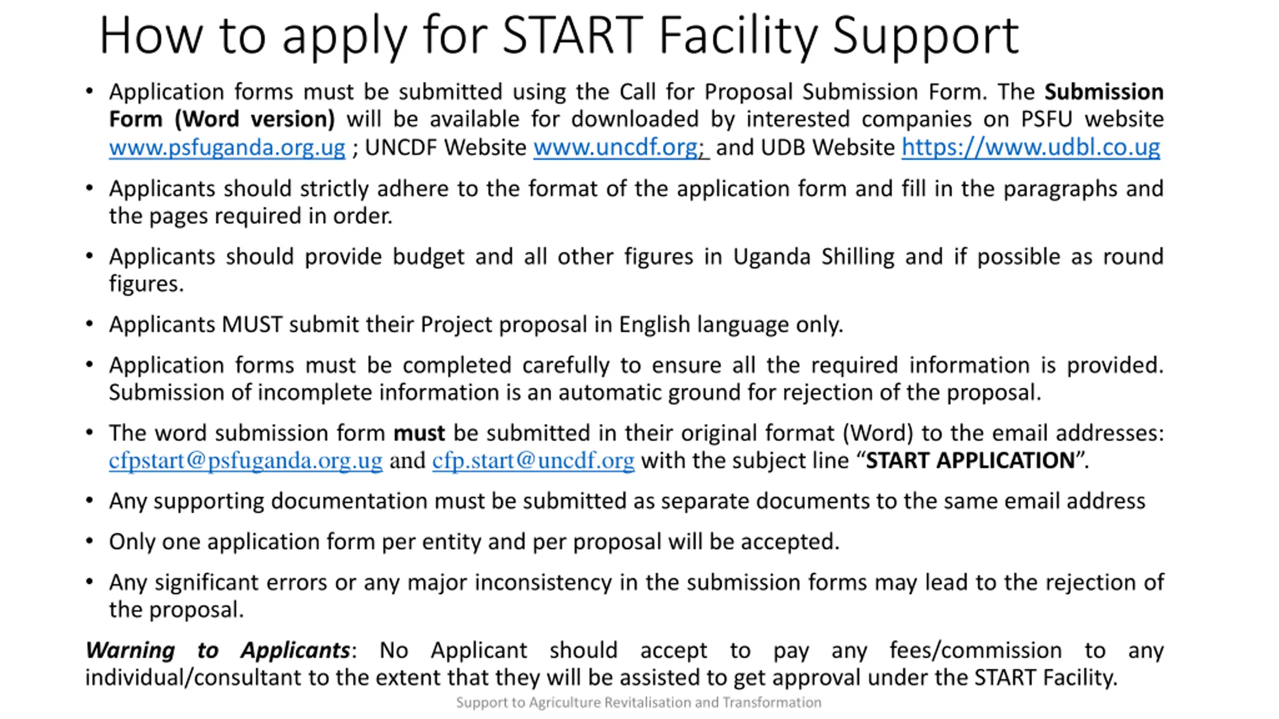 How to apply for START Facility Support Application forms must be submitted using the Call for Proposal Submission Form. The Submission Form (Word version) will be available for downloaded by interested companies on PSFU website www.psfuganda.org.ug ; UNCDF Website www.uncdf.org; and UDB Website https://www.udbl.co.ug Applicants should strictly adhere to the format of the application form and fill in the paragraphs and the pages required in order. Applicants should provide budget and all other figures in Uganda Shilling and if possible as round figures. Applicants MUST submit their Project proposal in English language only. Application forms must be completed carefully to ensure all the required information is provided. Submission of incomplete information is an automatic ground for rejection of the proposal. The word submission form must be submitted in their original format (Word) to the email addresses: cfpstart@psfuganda.org.ug and cfp.start@uncdf.org with the subject line START APPLICATION . Any supporting documentation must be submitted as separate documents to the same email address Only one application form per entity and per proposal will be accepted. Any significant errors or any major inconsistency in the submission forms may lead to the rejection of the proposal. Warning to Applicants: No Applicant should accept to pay any fees/commission to any individual/consultant to the extent that they will be assisted to get approval under the START Facility. Support to Agriculture Revitalisation and Transformation