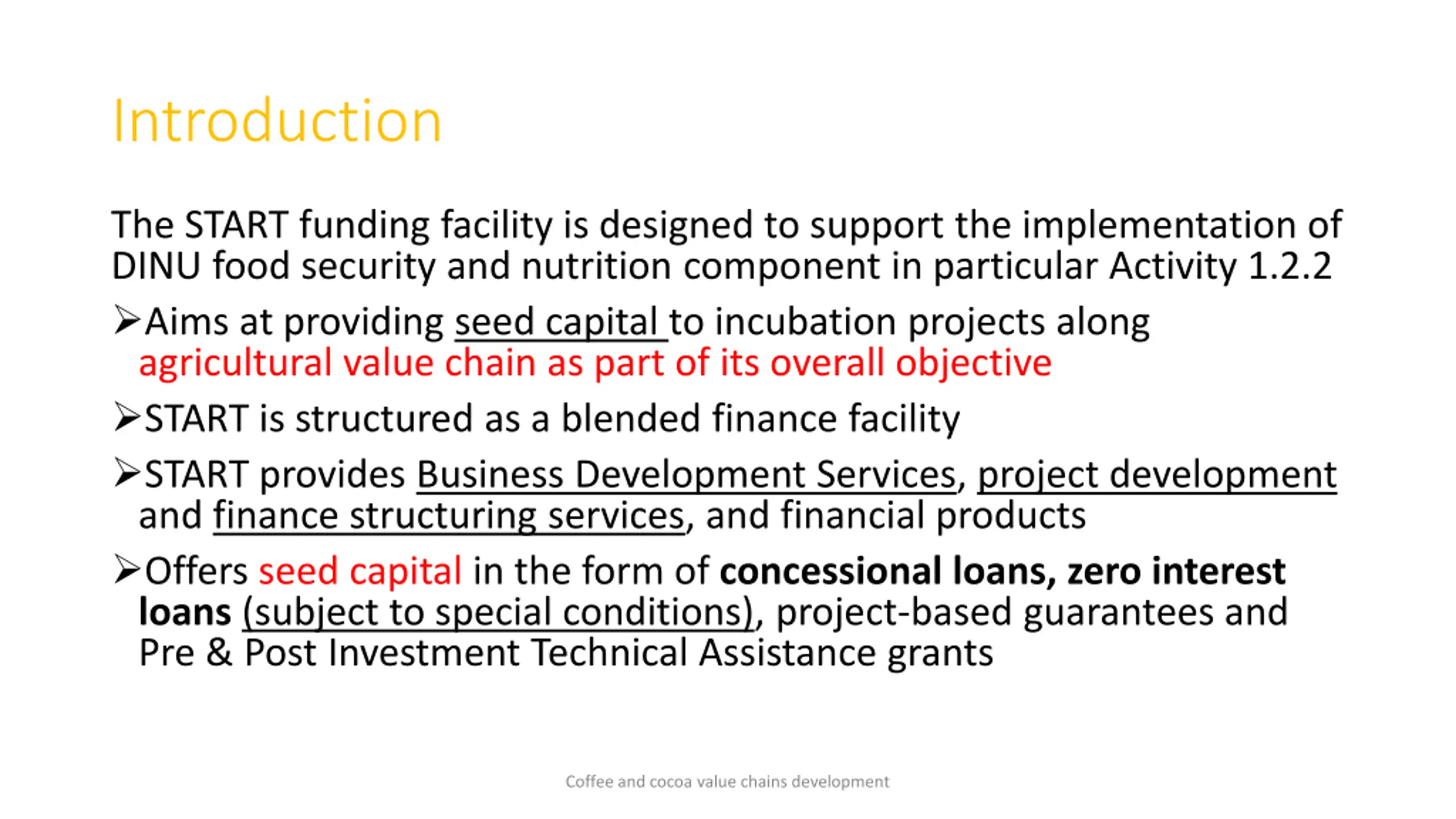 Introduction The START funding facility is designed to support the implementation of DINU food security and nutrition component in particular Activity 1.2.2 Aims at providing seed capital to incubation projects along agricultural value chain as part of its overall objective START is structured as a blended finance facility START provides Business Development Services, project development and finance structuring services, and financial products Offers seed capital in the form of concessional loans, zero interest loans (subject to special conditions), project-based guarantees and Pre & Post Investment Technical Assistance grants Coffee and cocoa value chains development