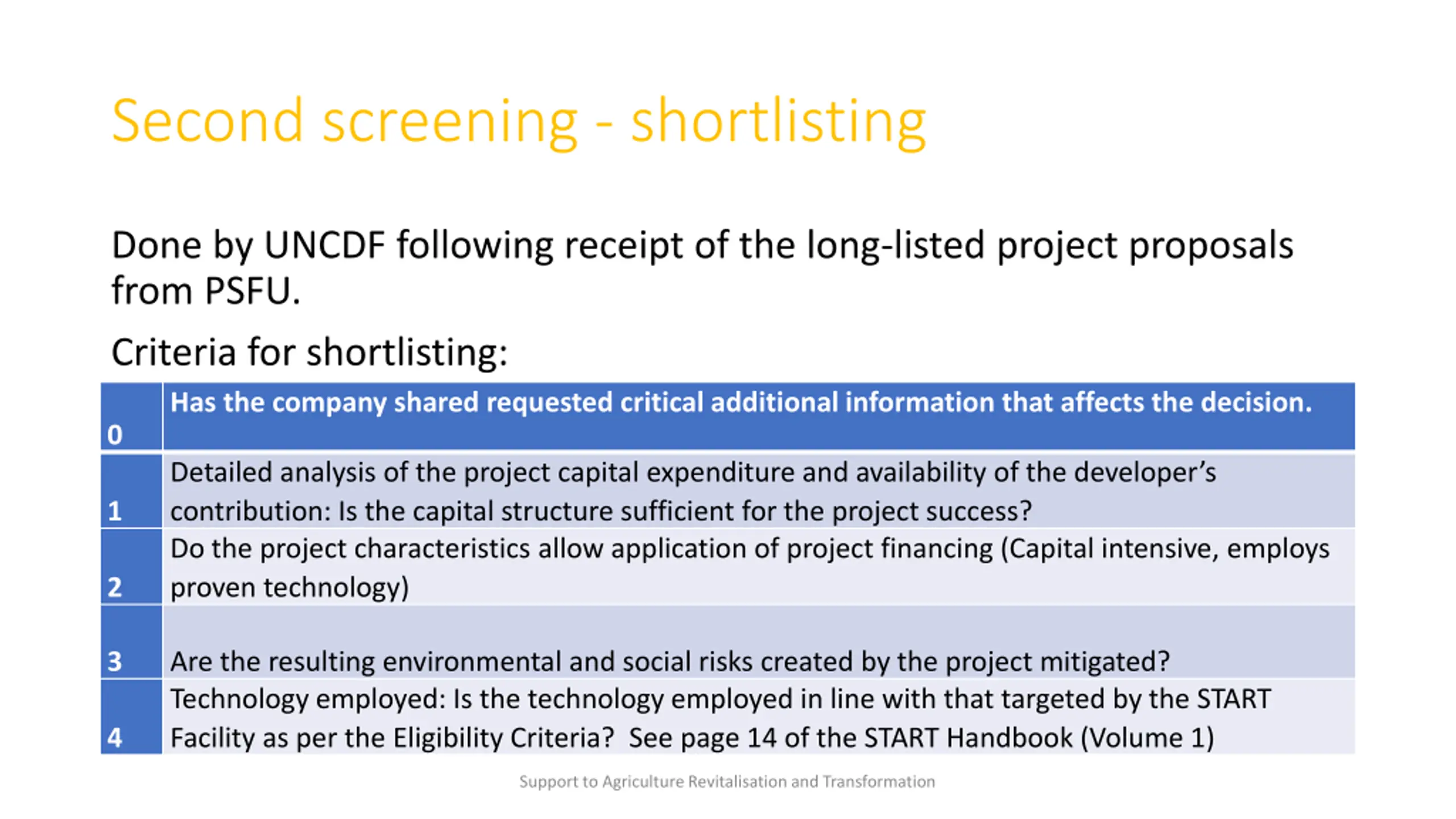 Second screening - shortlisting Done by UNCDF following receipt of the long-listed project proposals from PSFU. Criteria for shortlisting: Has the company shared requested critical additional information that affects the decision. 0 Detailed analysis of the project capital expenditure and availability of the developer s contribution: Is the capital structure sufficient for the project success? Do the project characteristics allow application of project financing (Capital intensive, employs proven technology) 1 2 3 Are the resulting environmental and social risks created by the project mitigated? Technology employed: Is the technology employed in line with that targeted by the START Facility as per the Eligibility Criteria? See page 14 of the START Handbook (Volume 1) 4 Support to Agriculture Revitalisation and Transformation