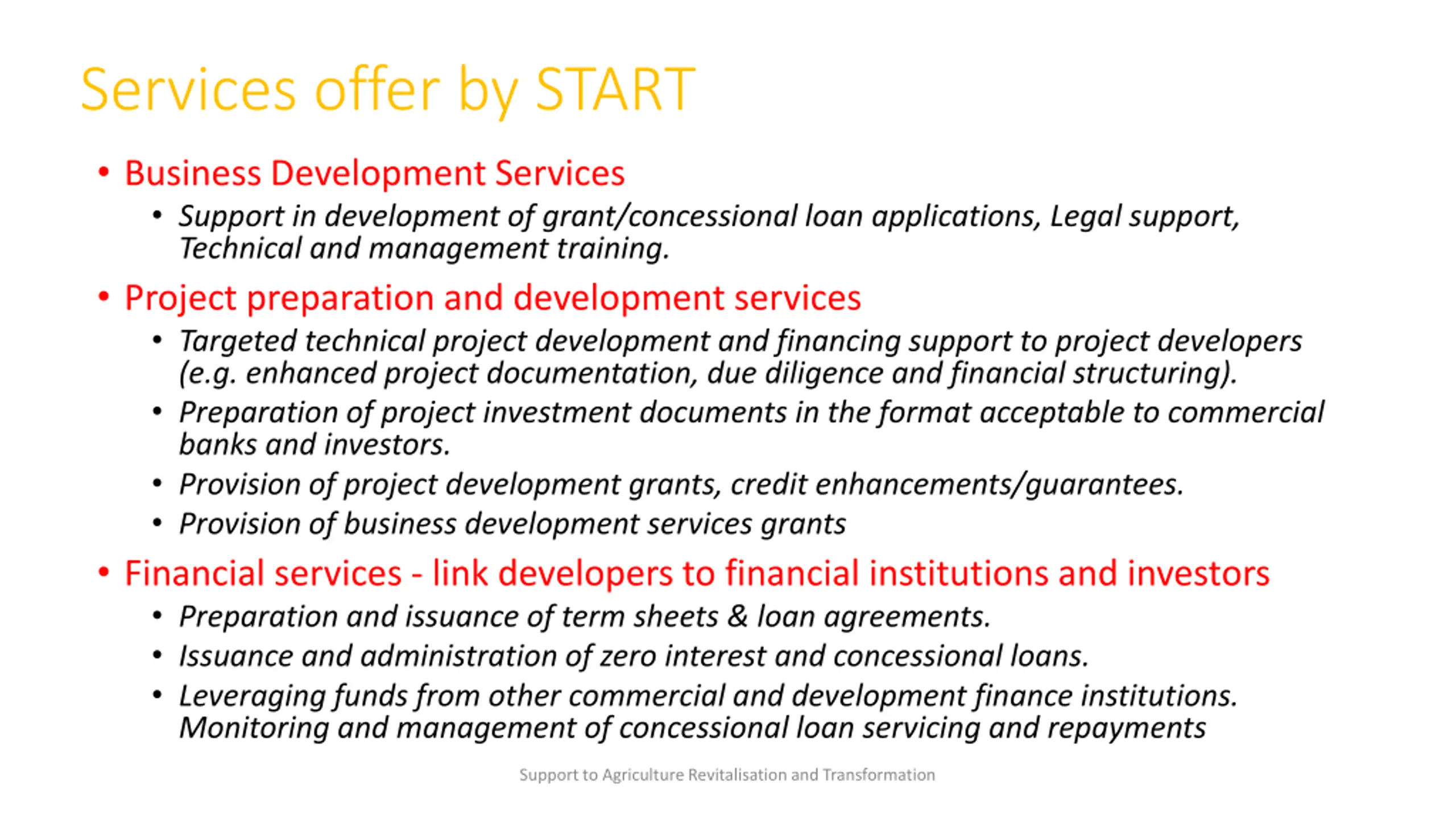 Services offer by START Business Development Services Support in development of grant/concessional loan applications, Legal support, Technical and management training. Project preparation and development services Targeted technical project development and financing support to project developers (e.g. enhanced project documentation, due diligence and financial structuring). Preparation of project investment documents in the format acceptable to commercial banks and investors. Provision of project development grants, credit enhancements/guarantees. Provision of business development services grants Financial services - link developers to financial institutions and investors Preparation and issuance of term sheets & loan agreements. Issuance and administration of zero interest and concessional loans. Leveraging funds from other commercial and development finance institutions. Monitoring and management of concessional loan servicing and repayments Support to Agriculture Revitalisation and Transformation